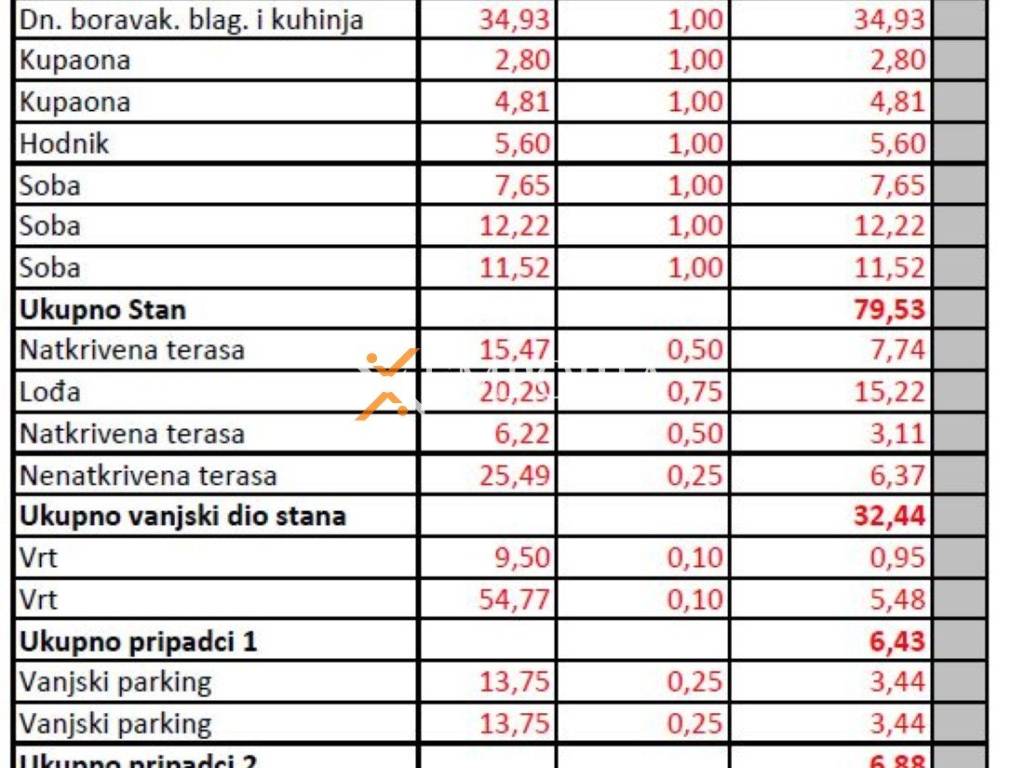 Dodatno stanu pripada vrt od 64,27 m2 i dva vanjska parkirališna mjesta. Ukupna neto površina s pripacima iznosi 125,27 m2.