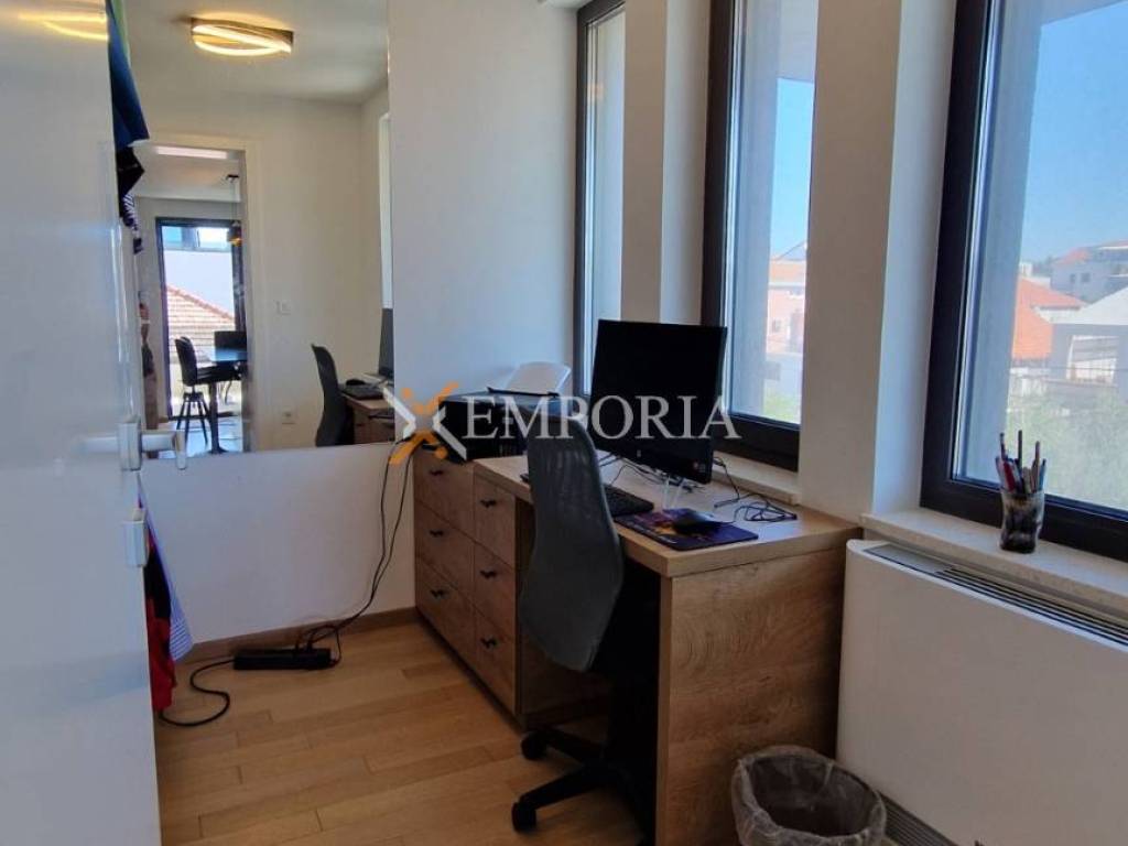 Stan se sastoji od hodnika, dvije spavaće sobe, radne sobe, kupaonice, zasebnog WC-a, kuhinje s blagovaonicom i dnevnim boravkom te natkrivene terase. Iz stubišta se pristupa prostranoj krovnoj terasi površine 85,88 m², koja je dijelom natkrivena i pruža djelomičan pogled na more – savršena za opuštanje i druženje.