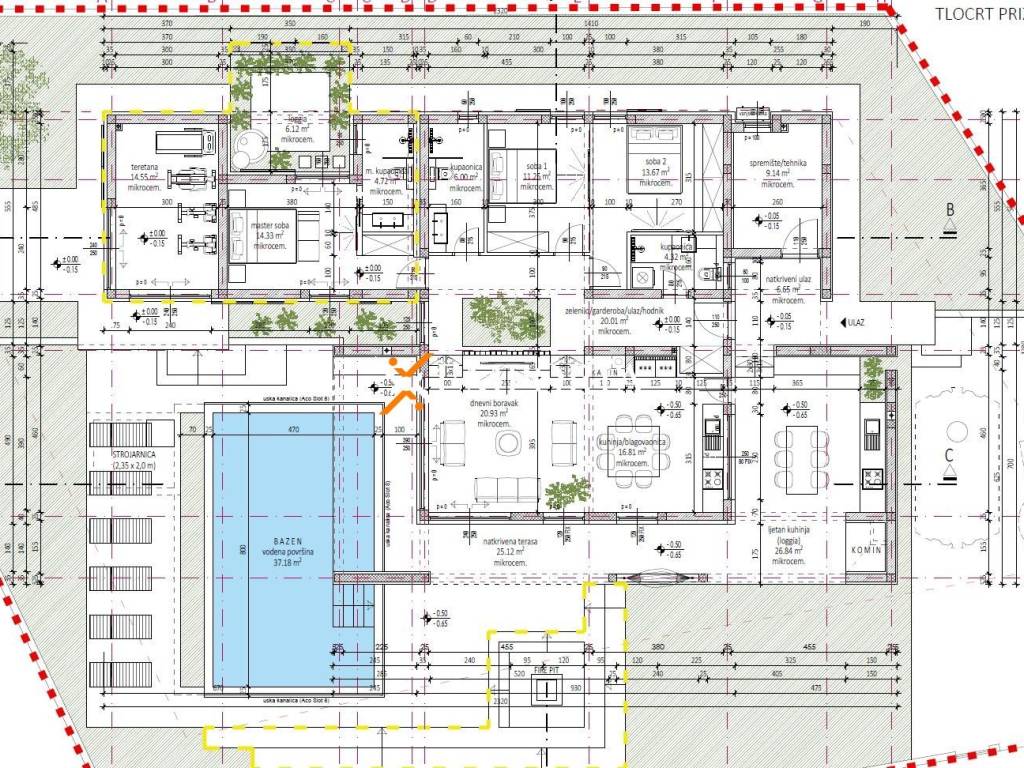 Za predmetnu parcelu već je ishođena građevinska dozvola i glavni projekt. Dozvola predviđa gradnju kuće neto korisne površine 168,65 m², a kuća je projektirana za izgradnju u dvije faze. U prvoj fazi planirana je izgradnja ulaznog dijela, vanjskog spremišta, dvije spavaće sobe, dvije kupaonice, kuhinje i dnevnog boravka. Također će se realizirati vanjska terasa s ljetnom kuhinjom te bazen dimenzija 8x4,70 m (37,18 m²) sa strojarnicom. Nakon završetka prve faze kuća će biti potpuno uporabiva, a u drugoj fazi predviđena je dogradnja master spavaće sobe s vlastitom kupaonicom, teretane te uređenje vanjskog ložišta – fire pita.