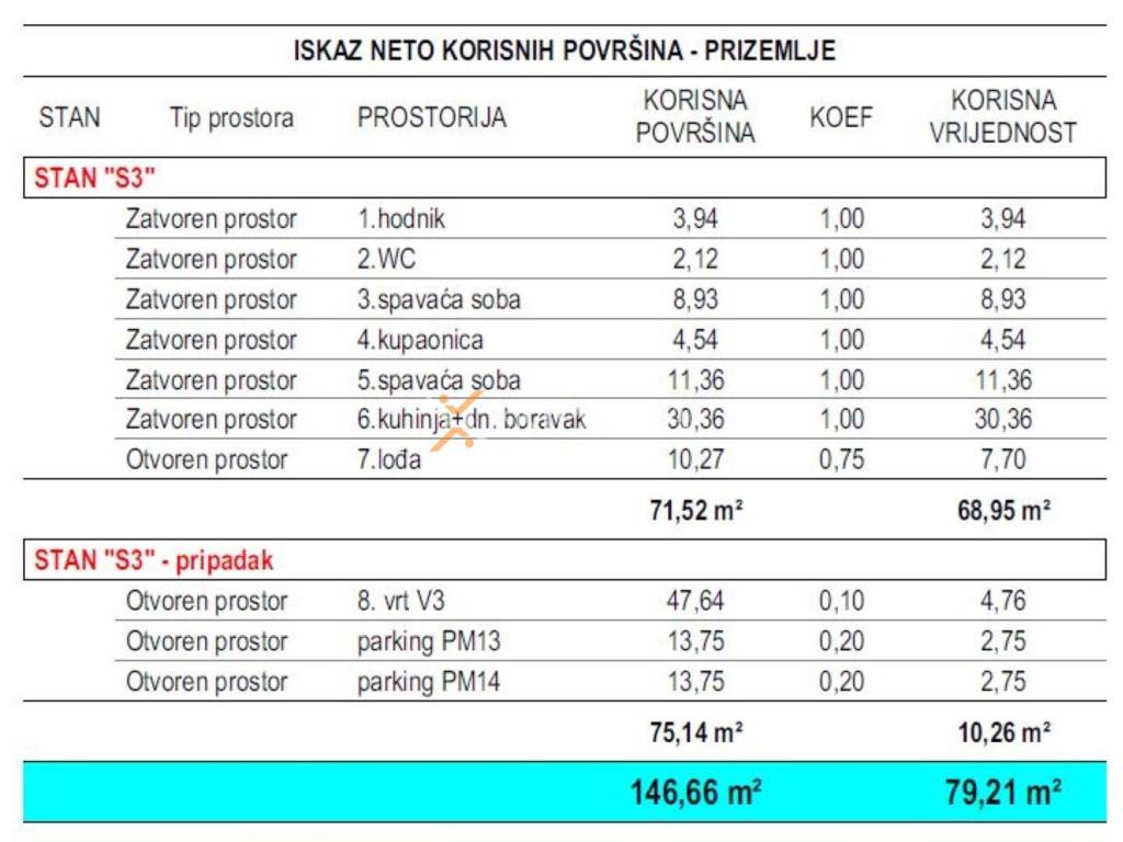 Stan se nalazi u prizemlju te nudi funkcionalan i moderan raspored. Prostor čine hodnik, dvije spavaće sobe, kupaonica, dodatni WC, kuhinja s blagovaonicom i dnevnim boravkom te lođa. Neto korisna površina opisanih prostorija iznosi 68,95 m². Uz stan dolazi privatni vrt površine 47,64 m², kao i dva parkirna mjesta. Ukupna neto površina stana s pripacima iznosi 79,21 m².
