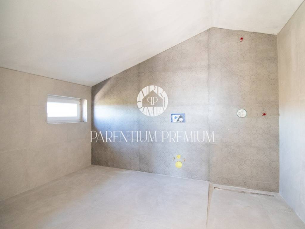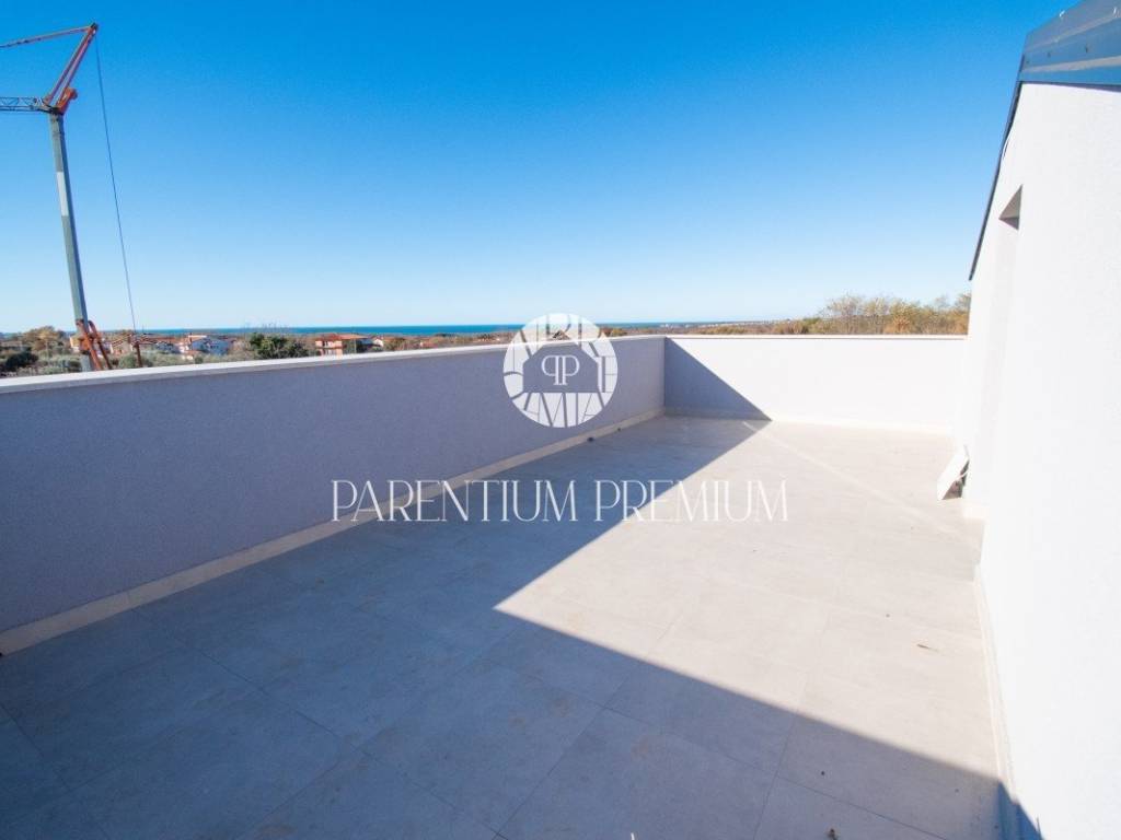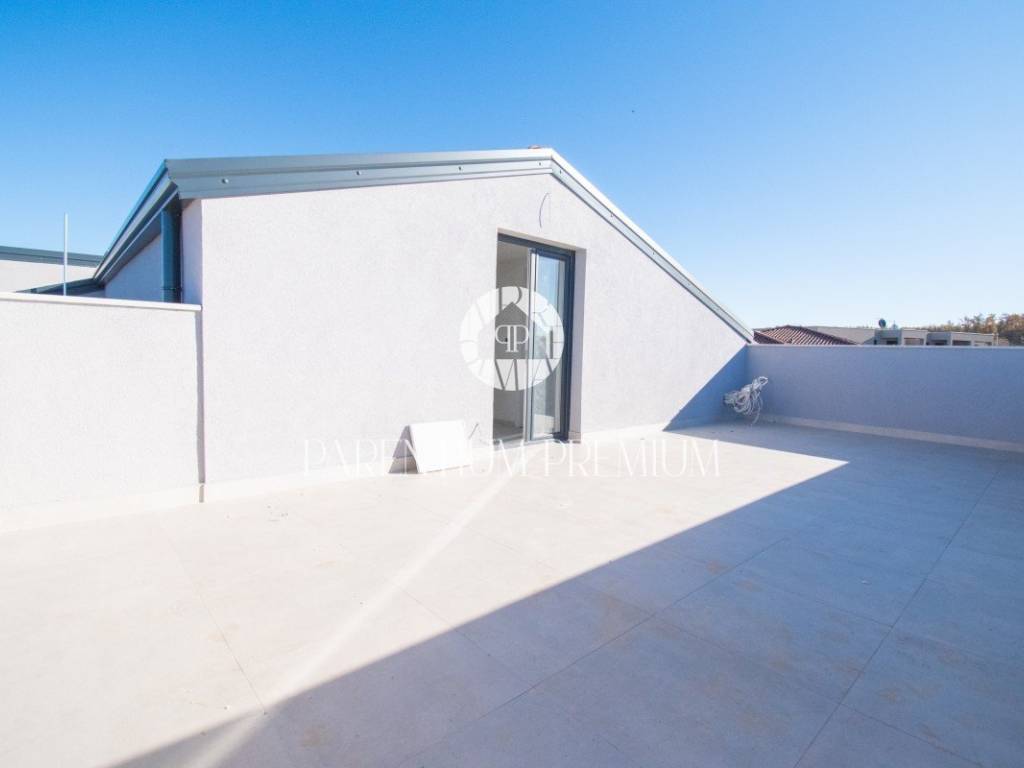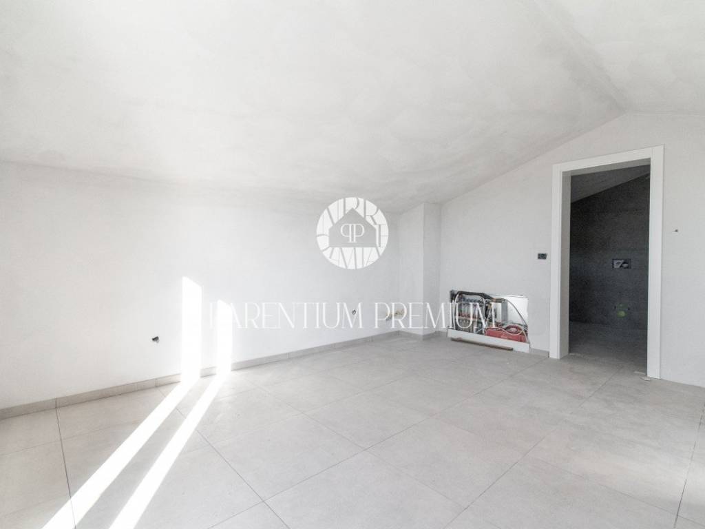 Prodaje se dvoetažni stan površine 76,49 m2, koji se proteže na prvom katu i potkrovlju stambene zgrade. Na prvom katu se nalazi dnevni boravak s kuhinjom i blagovaonicom, jedna spavaća soba i WC, stepenicama se dolazi na potkrovlje gdje se nalaze dvije spavaće sobe, kupaonica, galerija sa izlazom na veliku terasu od 30,94 m sa prekrasnim pogledom na more. Stan ima podno grijanje putem toplinske pumpe te klima uređaje u svakoj prostoriji. Stanu pripada jedno parkirno mjesto ispred zgrade. Kupci su oslobođeni plaćanja poreza na promet nekretnina. Ovaj stan je idealno rješenje stambenog pitanja ili kao investicija u turističke svrhe.