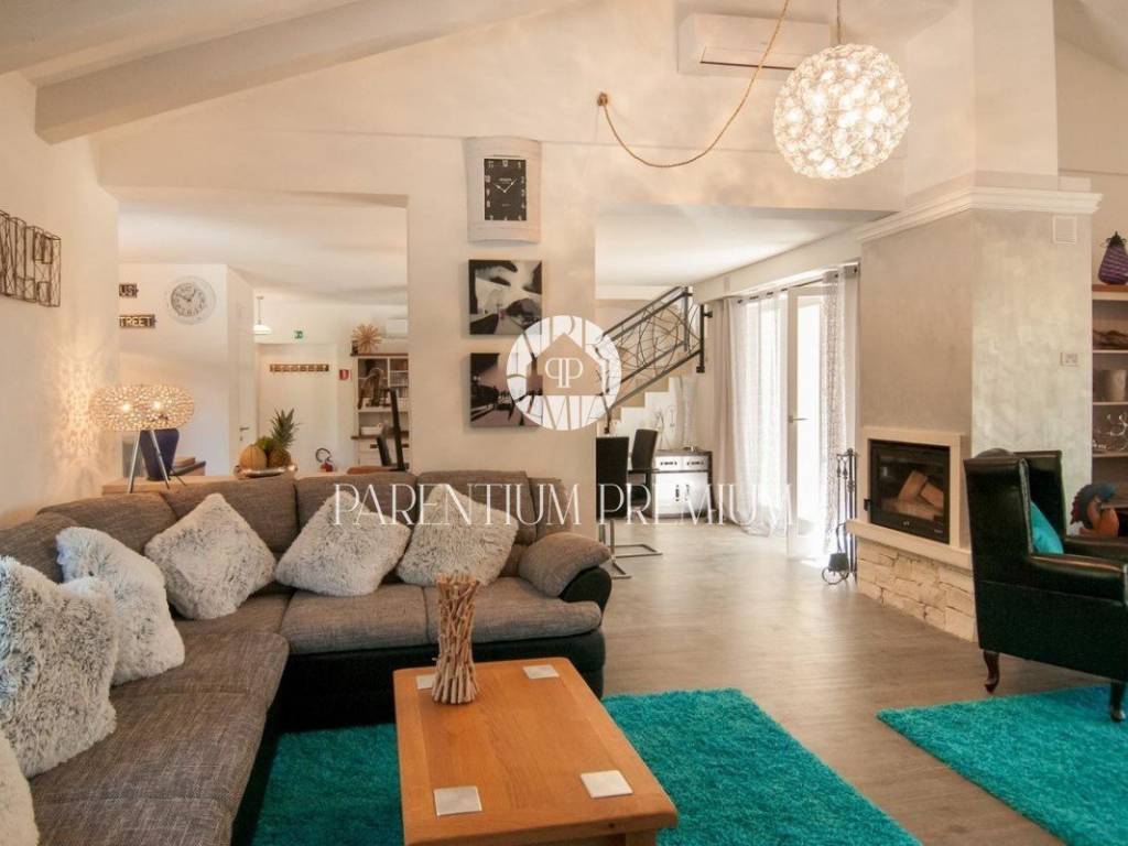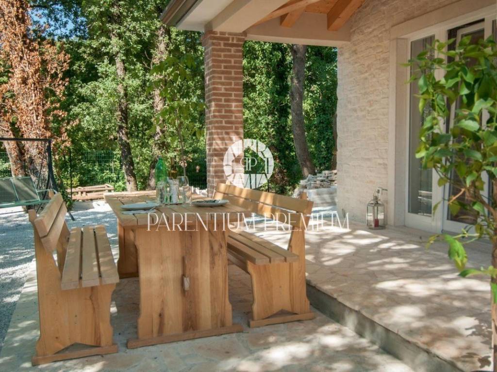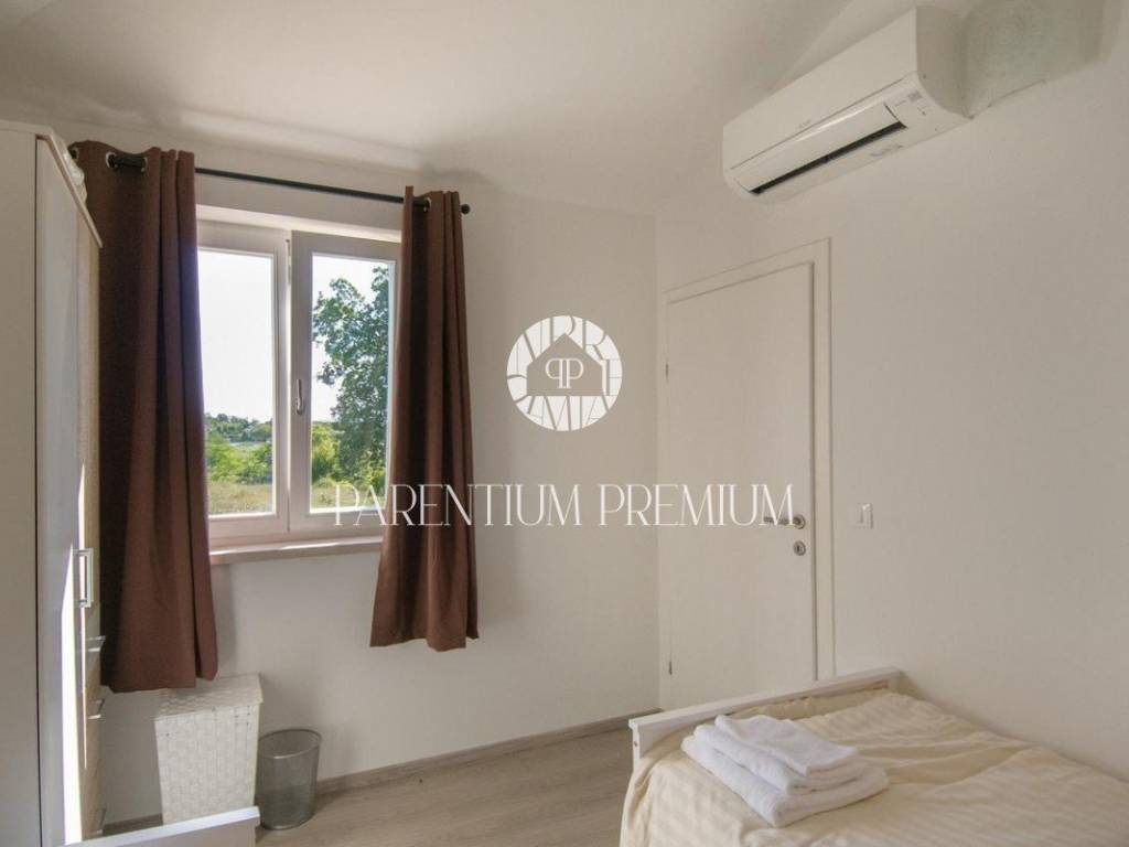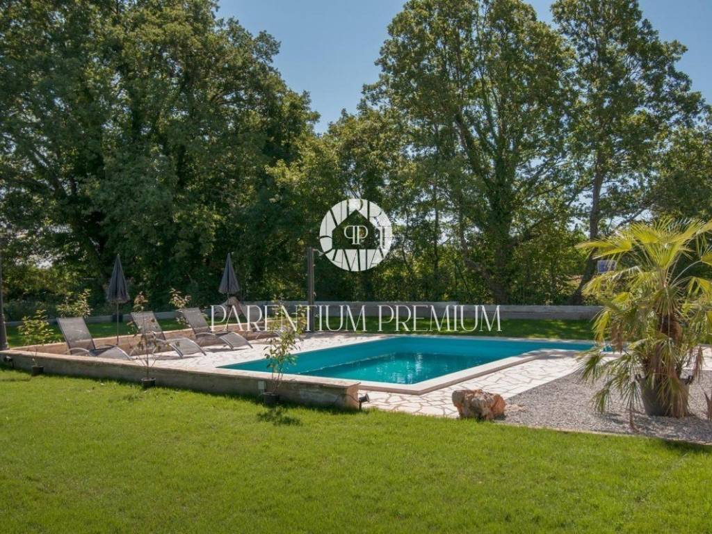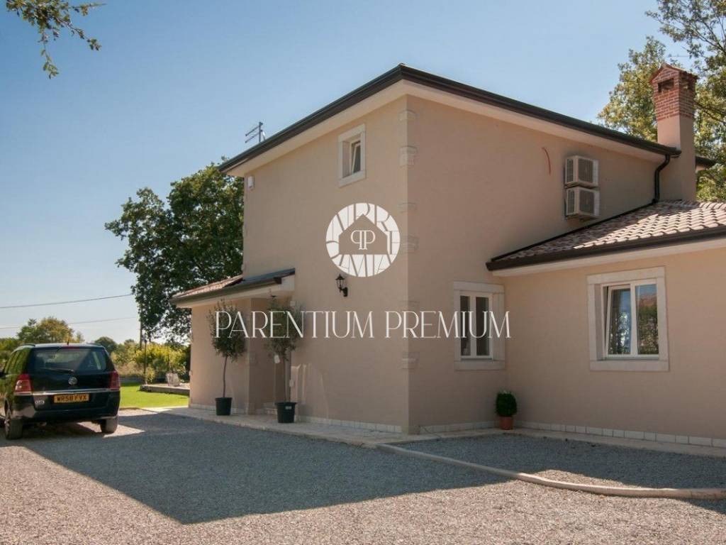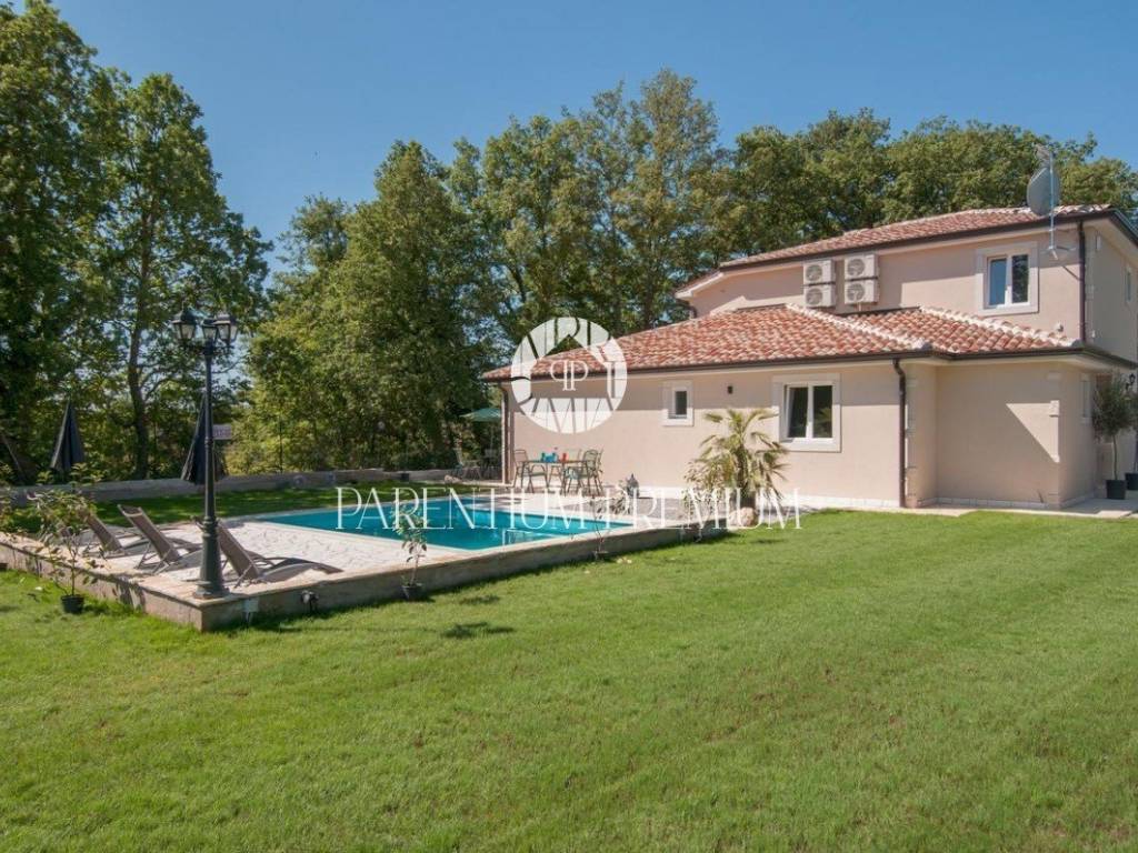 Vila se nalazi u mirnom mjestu u okolici Tinjana, te 20km od Poreča i mora. Vila je moderno dizajnirana i namještena te se proteže na dvije lijepo uređene i kvalitetno opremljene etaže. U prizemlju se nalaze dvije spavaće sobe, svaka s vlastitom kupaonicom, gostinjski WC, dnevni boravak s blagovaonicom i kuhinjom sa izlazom na natkrivenu terasu gdje se nalazi roštilj i klupa za uživanje u ljetnim mjesecima. Unutarnjim stepenicama se dolazi na drugi kat gdje se nalaze dvije spavaće sobe, kupaonica i terasa. Velika okućnica je lijepo uređena ima bazen od 22m2 te je ograđena zelenilom koje pruža vlasnicima privatnost. Prostrani šljunčani parking za više automobila se nalazi ispred kuće. Grijanje i hlađenje je putem klima uređaja, dok se u dnevnom boravku nalazi kamin na drva za lijepi ugođaj u zimskim mjesecima. Vila se prodaje potpuno namještena. Ova vila je idealno riješenje stambenog pitanja ili kao investicija u svrhu turističkog najma. Nekretnina je upisana na pravnu osobu. ID: 2008_0105