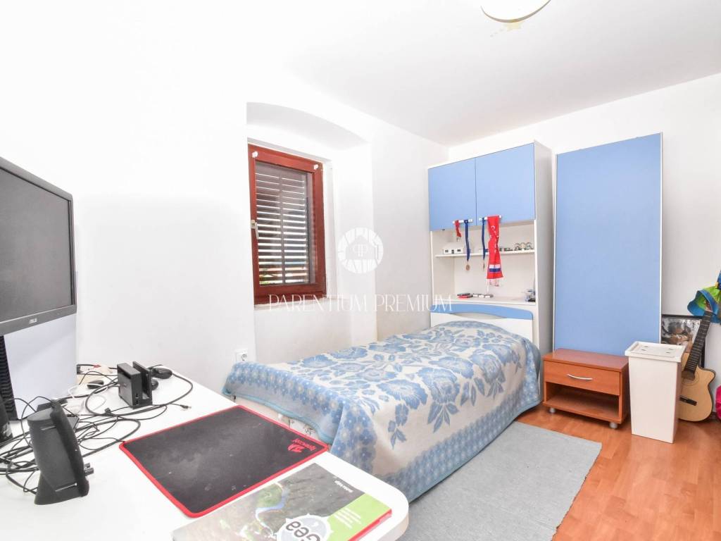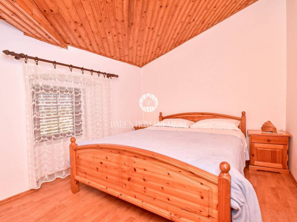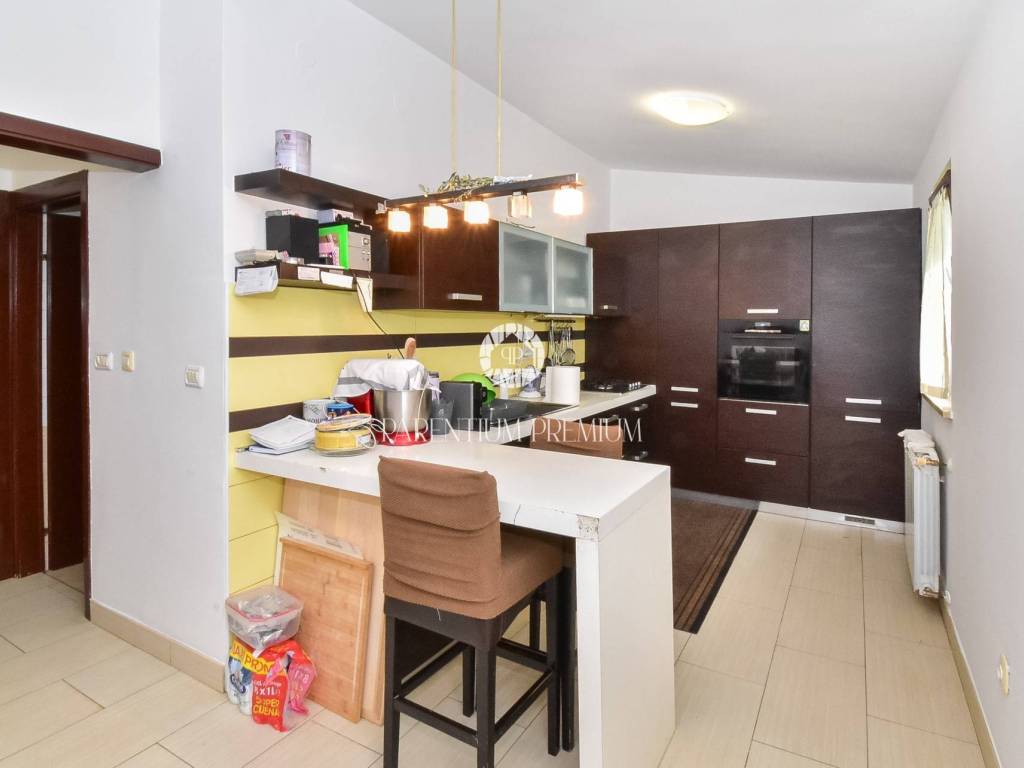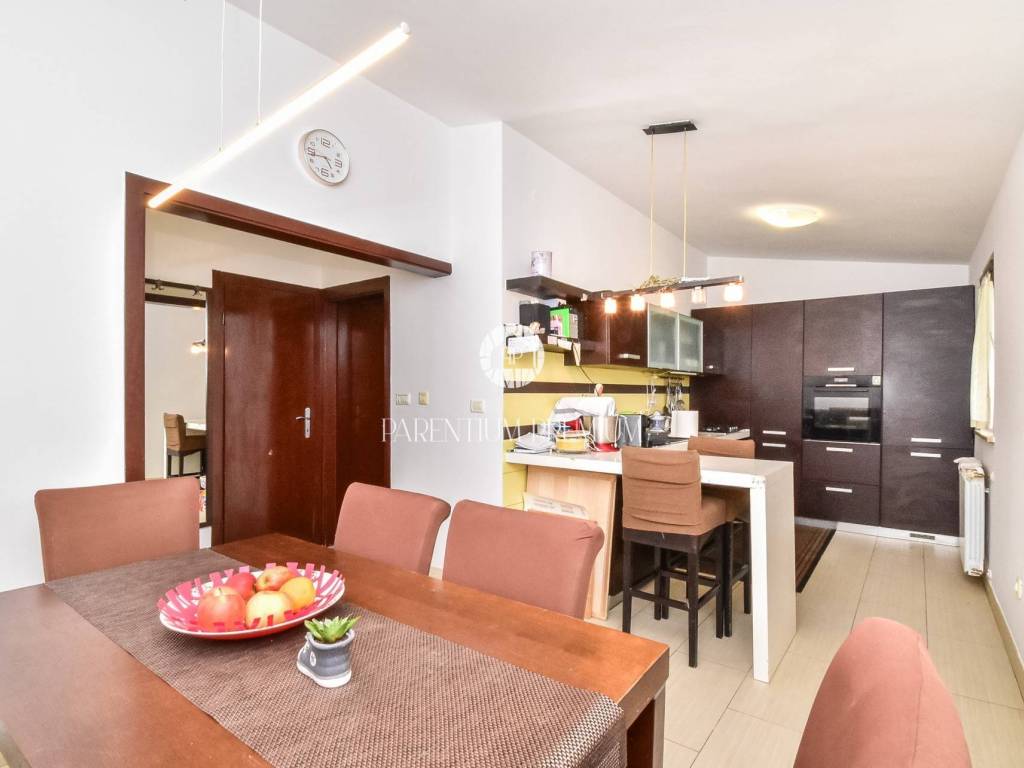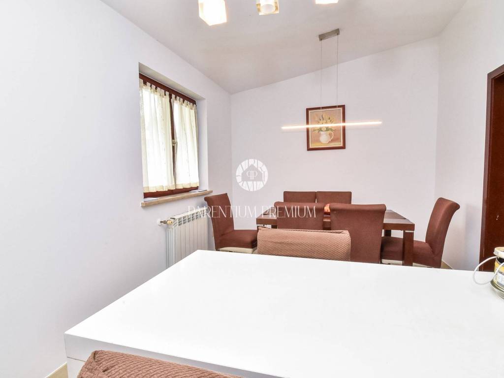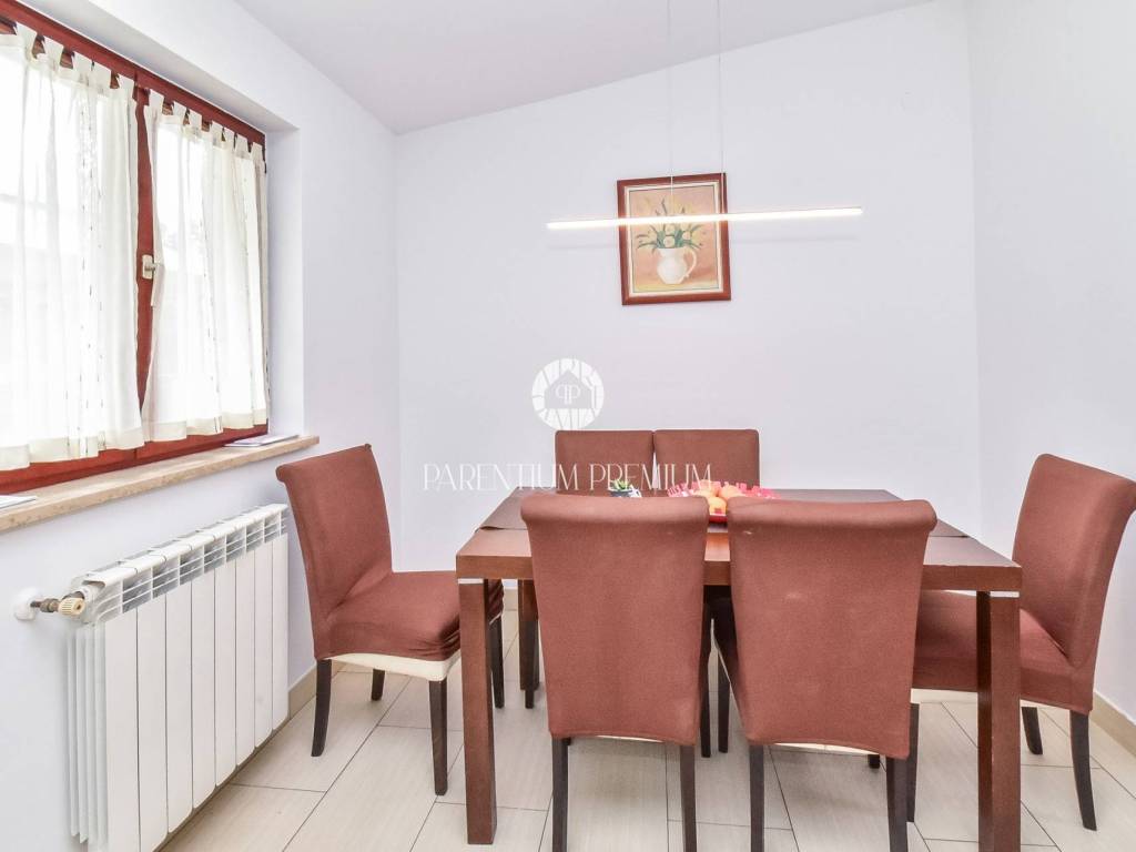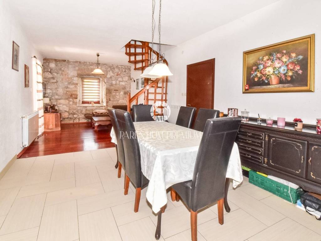Prodaje se dvojna kuća 5km od mora i grada Poreča. Kuća se nalazi na zemljištu od 497m2, te se proteže na tri etaže ukupne površine 125m2. U prizemlju se nalazi ulazni hodnik, kuhinja s blagovaonicom, Veliki dnevni boravak s blagovaonicom, ostava i Kupaonica sa masažnom kadom. Na prvom katu se nalaze dvije spavaće sobe i jedna kupaonica. Na drugom katu se nalaze također dvije spavaće sobe sa kupaonicom. Kuća ima veliku natkrivenu terasu od 32m2 u prizemlju za uživanje u toplim mjesecima. U dvorištu se nalaze 3 parkirna mjesta i garaža od 32m2 koja se prenamjenila u konobu sa kaminom za druženja. Grijanje je centralno na lož ulje. Kuća je renovirana 2009g. Kuća se prodaje djelomično namještena. Ova kuća je idealno rješenje stambenog pitanja ili kao investicija.