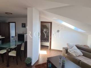 Stan se sastoji od kupaonice,dvije spavaće sobe, prostranog dnevnog boravka povezanog s kuhinjom i blagovaonicom. Tlocrtno je stan 70m2 a radi kosina je upisano 50m2. Stan je izuzetno osvjetljen i uredan a iz dnevnog boravka se pruže prekrasan pogled na more i grad. Stan je klimatiziran i prodaje se kompletno namješten.