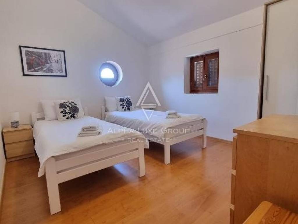 Kuća se proteže na dvije etaže, prizemlje i kat. Unutrašnjost obuhvaća prostran i svijetao dnevni boravak povezan s kuhinjom i blagovaonicom, stvarajući ugodno okruženje za svakodnevni život i druženja. Na raspolaganju su tri pravilno raspoređene spavaće sobe i dvije kupaonice, koje osiguravaju funkcionalnost i komfor za obitelj ili goste. Iz dnevnog boravka omogućen je izravan izlaz na natkrivenu terasu, idealnu za objedovanje na otvorenom i uživanje u vrtu tijekom cijele godine.