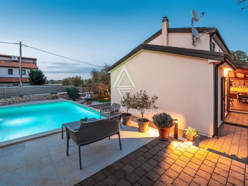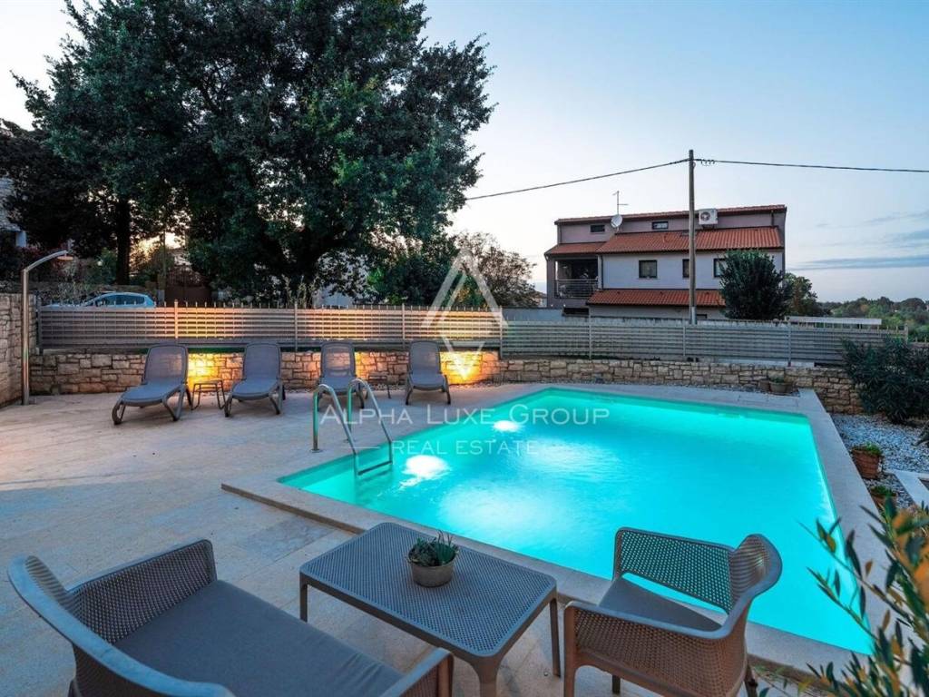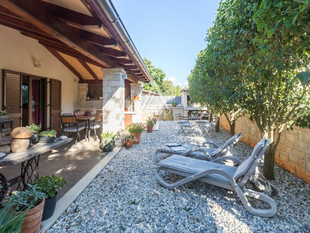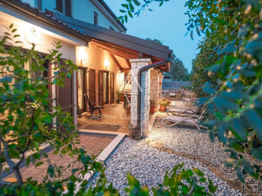Uređena i ograđena okućnica pruža privatnost i komfor tijekom cijele godine. U dvorištu se nalazi bazen s elektrolizom, ekološki prihvatljiv i jednostavan za održavanje, natkrivena ljetna kuhinja s kaminom idealna za druženja, te tri parkirna mjesta od kojih su dva natkrivena. Okruženje je mirno i ugodno za boravak, a istovremeno se do mora i centra Poreča dolazi za svega nekoliko minuta vožnje.