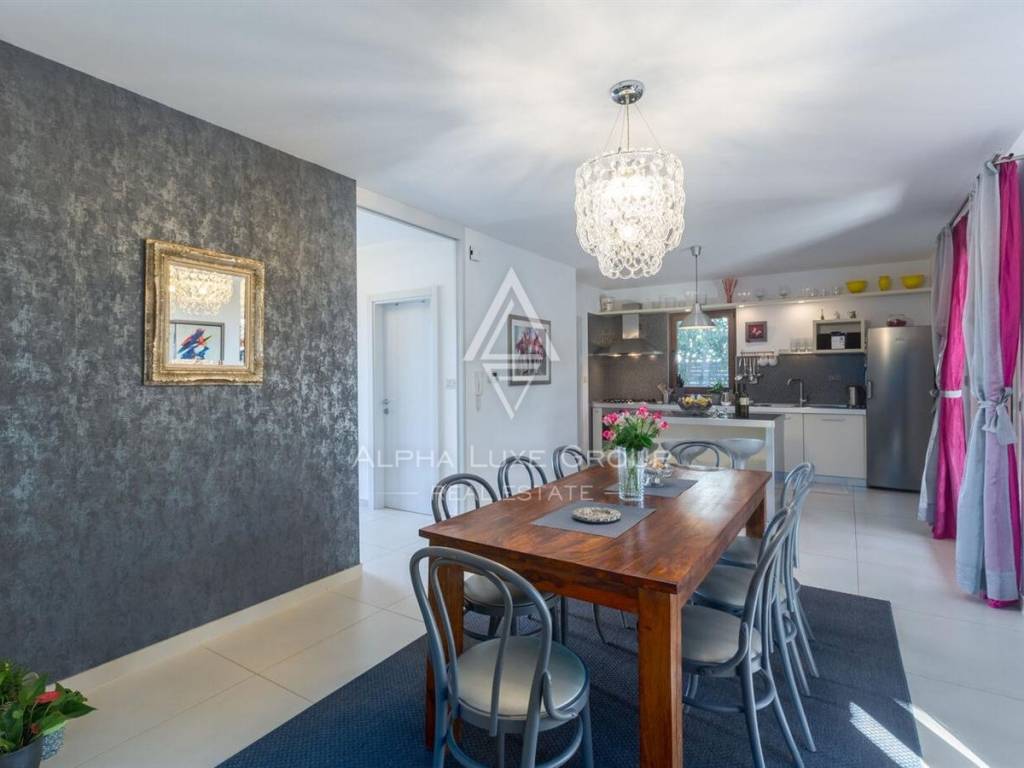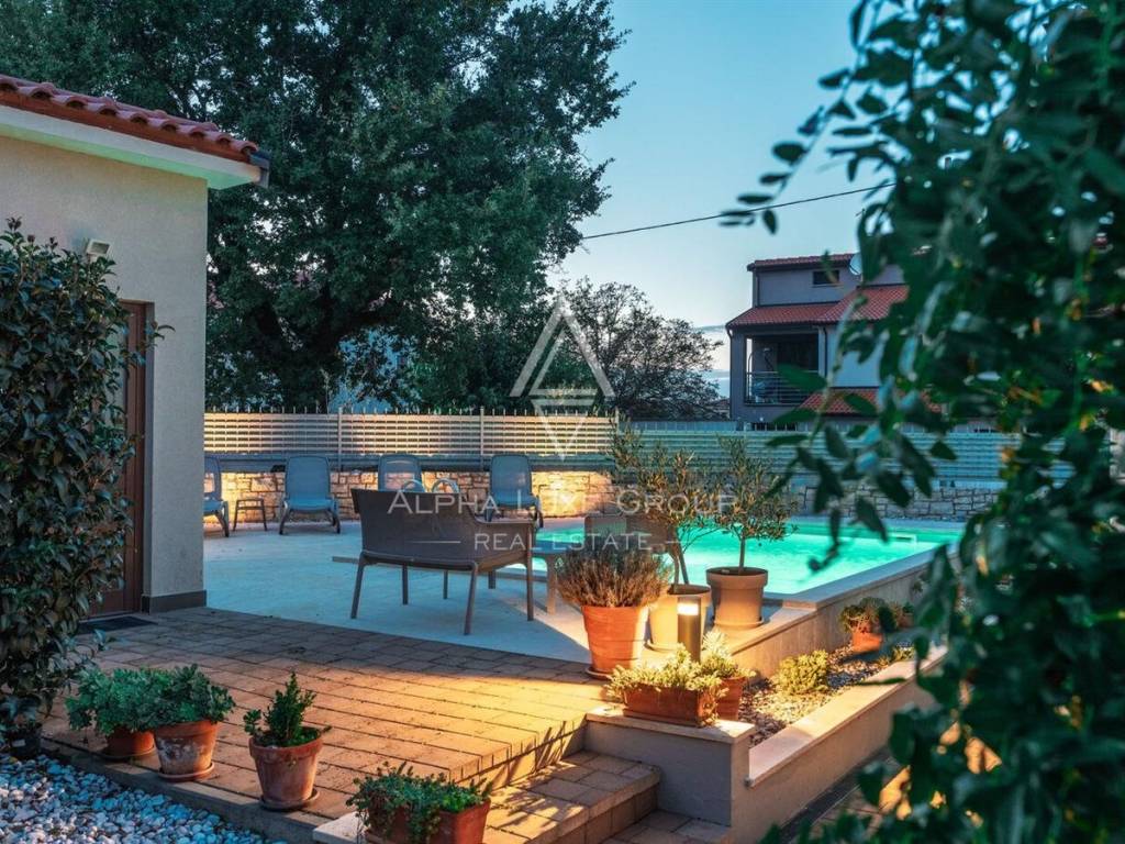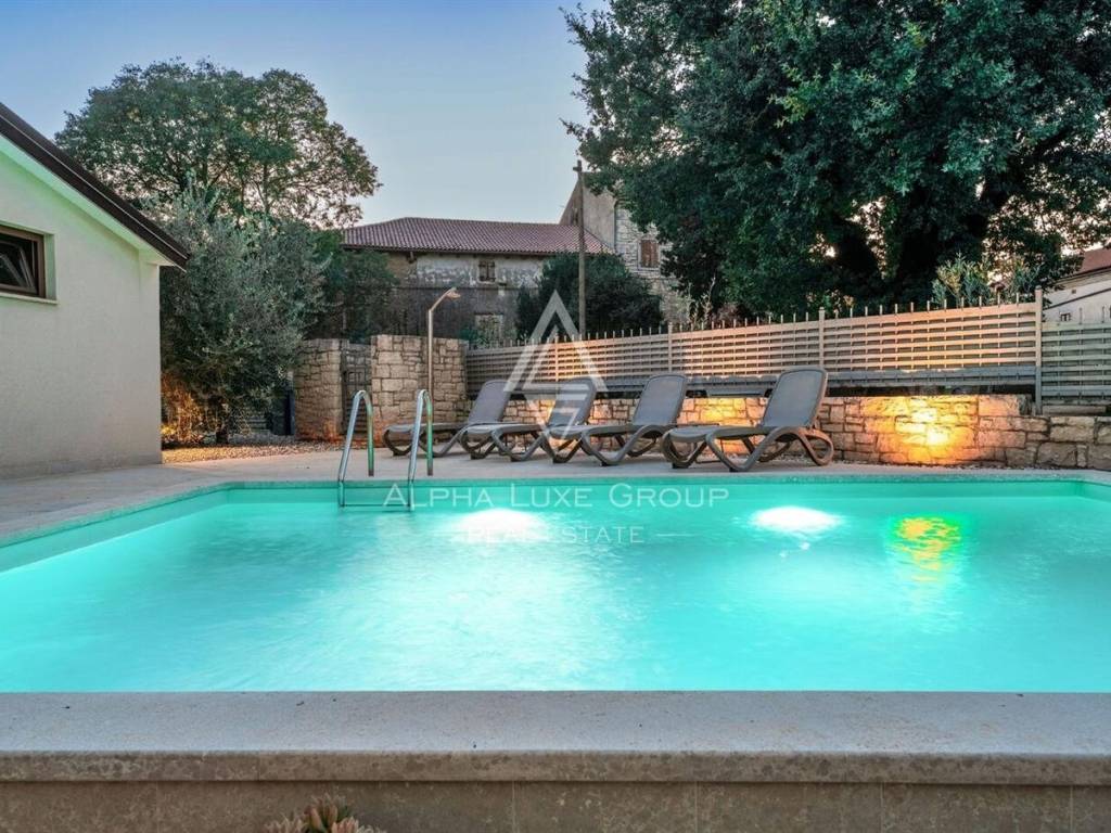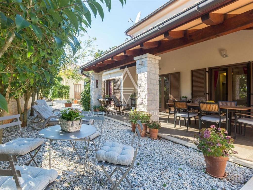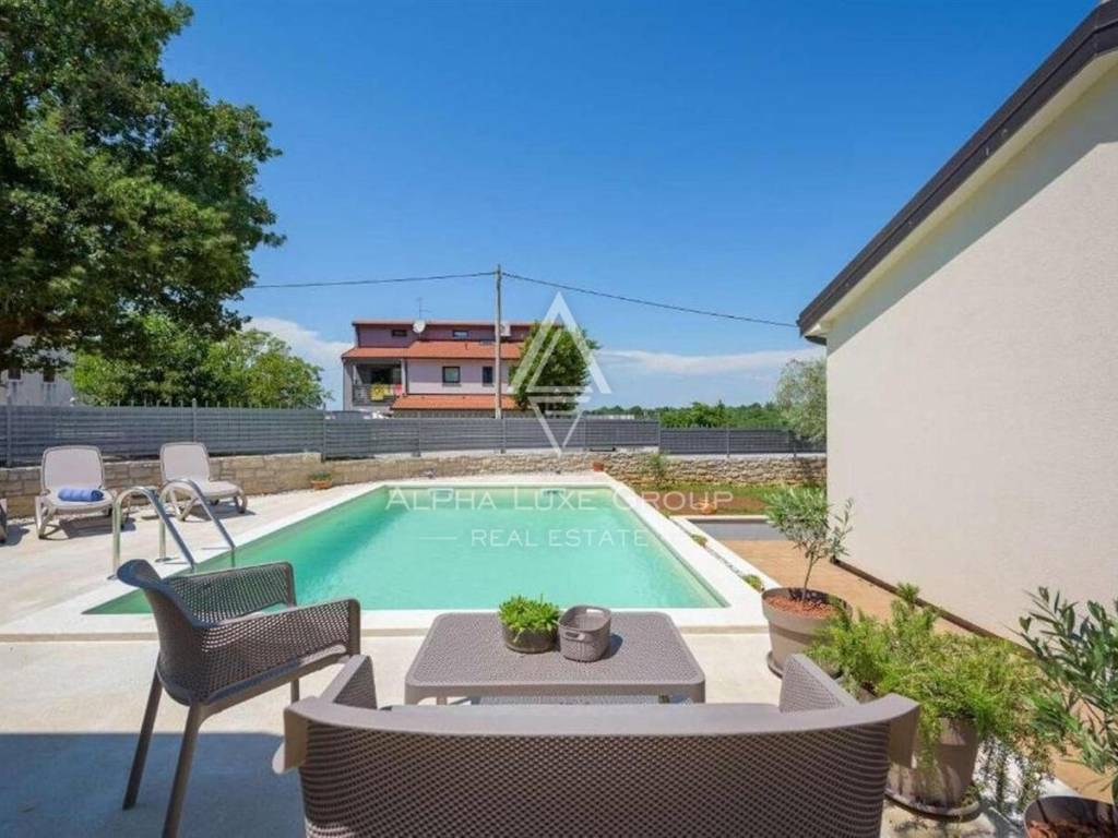 Uređena i ograđena okućnica pruža privatnost i komfor tijekom cijele godine. U dvorištu se nalazi bazen s elektrolizom, ekološki prihvatljiv i jednostavan za održavanje, natkrivena ljetna kuhinja s kaminom idealna za druženja, te tri parkirna mjesta od kojih su dva natkrivena. Okruženje je mirno i ugodno za boravak, a istovremeno se do mora i centra Poreča dolazi za svega nekoliko minuta vožnje.