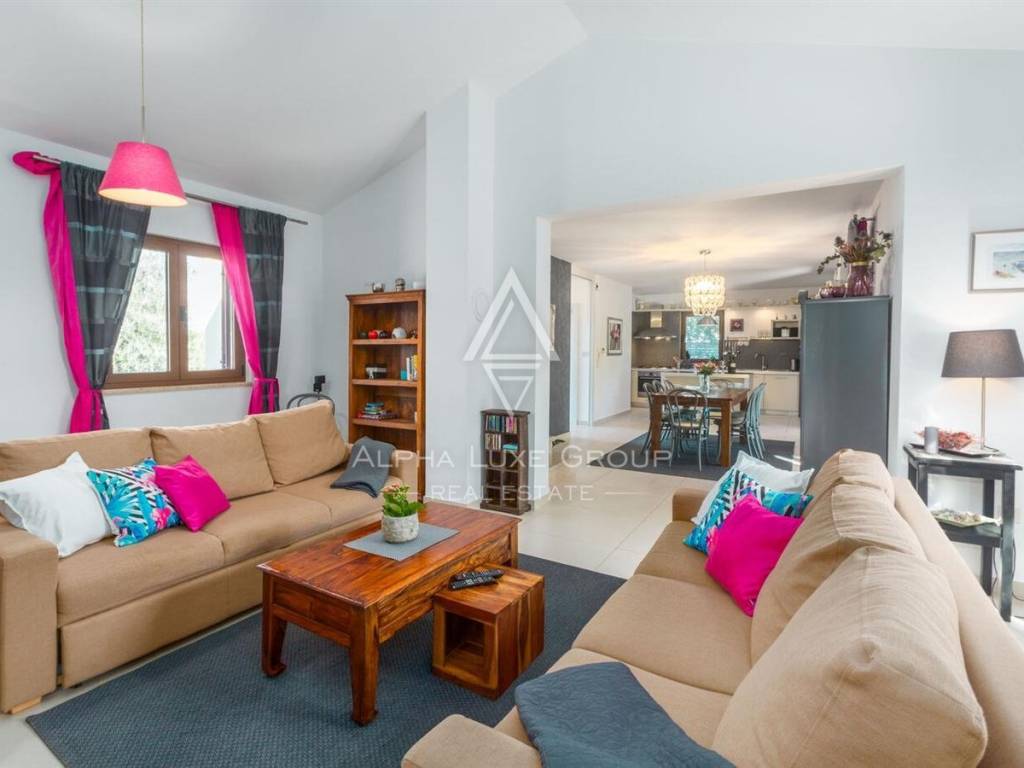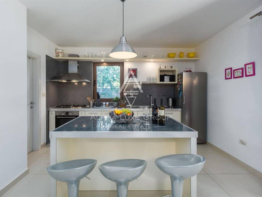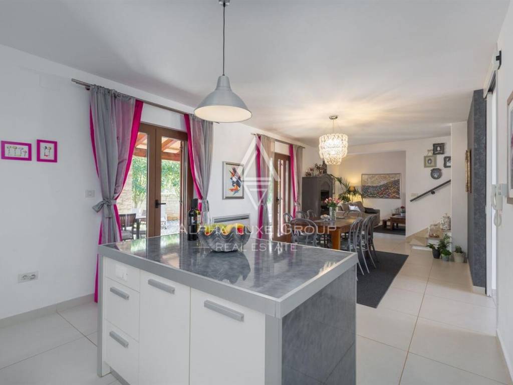 Prizemlje je zamišljeno kao otvoren i funkcionalan dnevni prostor te se sastoji od prostranog open-space dnevnog boravka povezanog s kuhinjom i blagovaonicom, uz praktičnu smočnicu, kupaonicu, vešeraj i kotlovnicu. Na katu se nalaze dvije komforne spavaće sobe, garderoba u sklopu glavne sobe te izlaz na privatnu terasu. Kuća je vrlo svijetla, ugodna za boravak i prilagođena svakodnevnom obiteljskom životu, a raspored omogućuje i odličan turistički najam.
