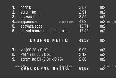 Stan oznake 11A, unutarnje površine 49.52m2, nalazi se u prizemlju zgrade i sastoji se od: hodnika, dnevnog boravka s kuhinjom i blagovaonom, 2 spavaće sobe, kupaone, spremišta, terase i vrta.