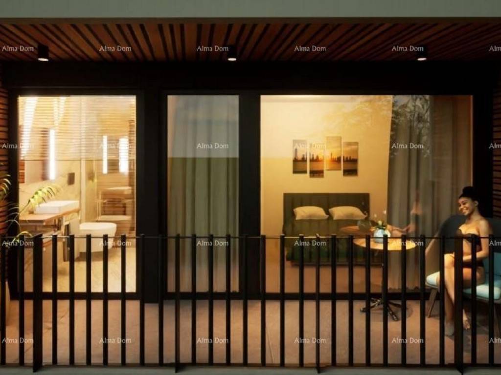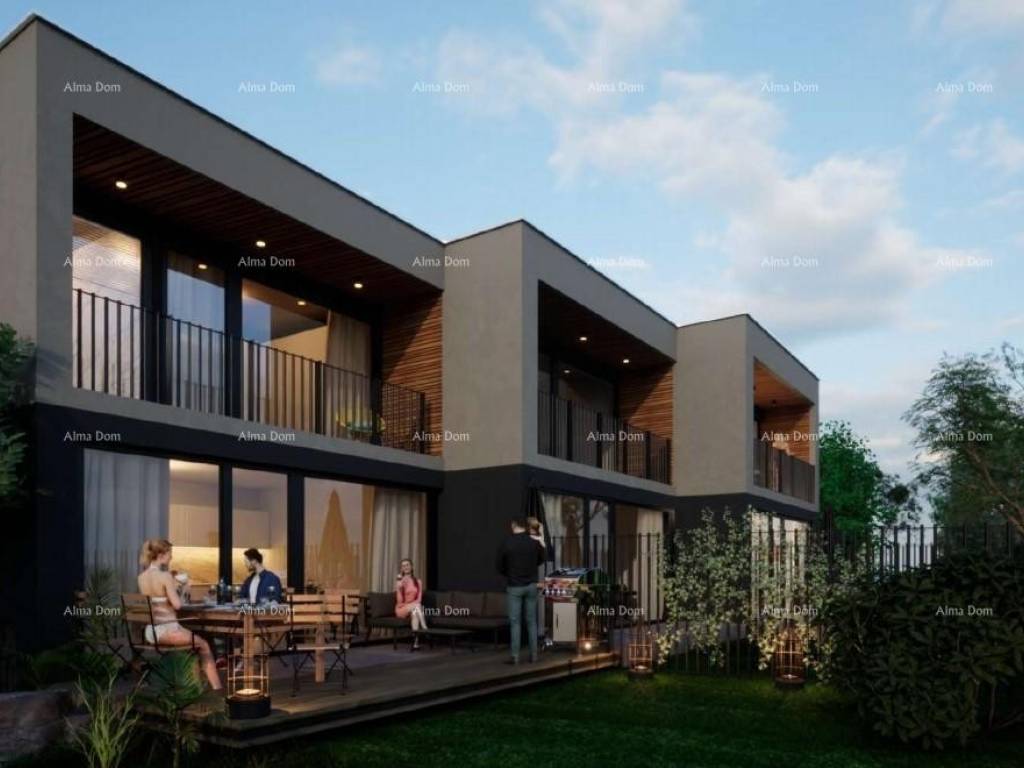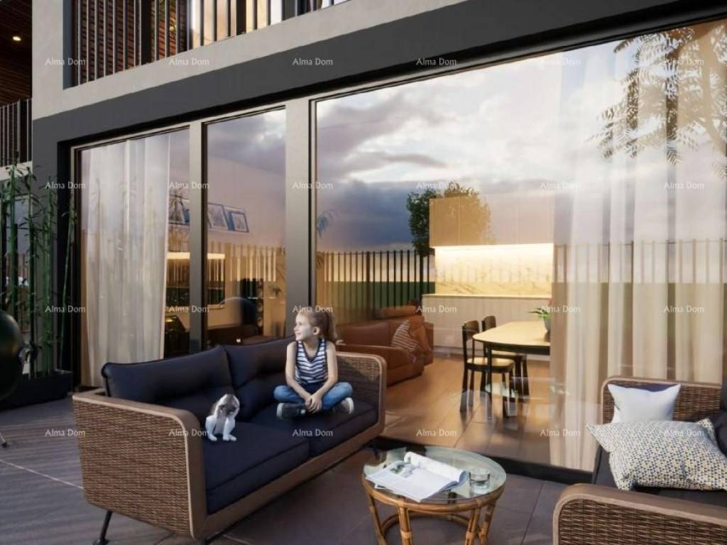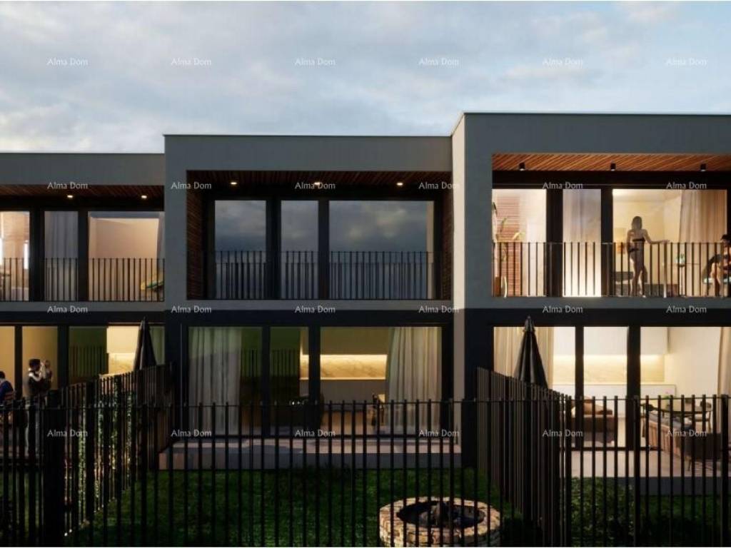 U prodaji je luksuzan stan u izgradnji na Mukalbi, Medulin, blizu mora. U projektu je samostojeća stambena zgrada sa 3 stambene jedinice, a u naravi su to 3 kuće u nizu. Svaka kuća/stan se sastoji od prizemlja s terasom i pripadajućem vrtom i kata, s kojeg se pruža pogled na more. Kuća u nizu ili drugim riječima dvokatan stan ima ukupnu stambenu površinu od 108 m2, 51 m2 u prizemlju i 57 m2 na katu, i njemu pripada 2 parkirnih mjesta.