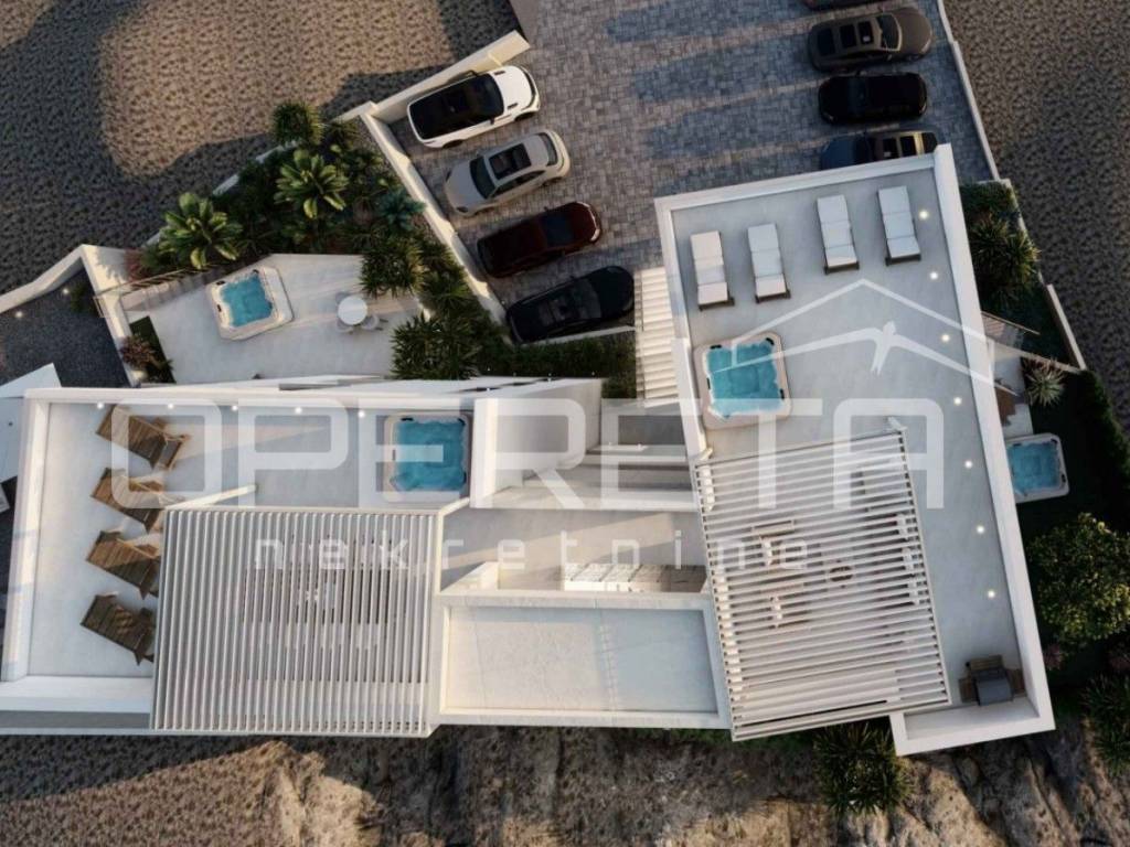Krovna terasa je ravan, prohodan krov s instalacijama vode i struje, spreman za ljetnu kuhinju, lounge zonu i sunčalište. Čelične ograde osiguravaju trajnost i sigurnost. Pogled na more je širok i trajan, pogodan za cjelodnevno korištenje vanjskog prostora.