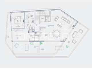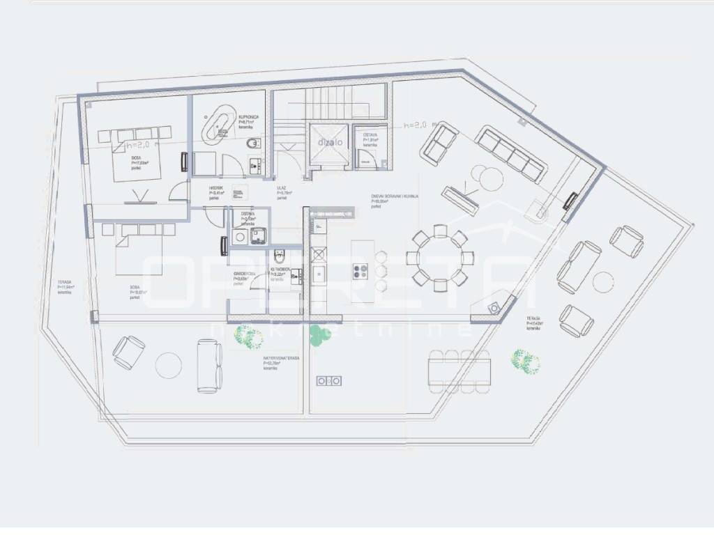 Tlocrtno, stan se sastoji od prostranog open-space dnevnog boravka s blagovaonicom i kuhinjom, dvije udobne spavaće sobe od kojih glavna ima vlastitu kupaonicu dodatne kupaonice i spremišta. Sve glavne prostorije imaju direktan izlaz na veliku privatnu terasu, čime se prostor dodatno otvara i povezuje s vanjskim okruženjem.