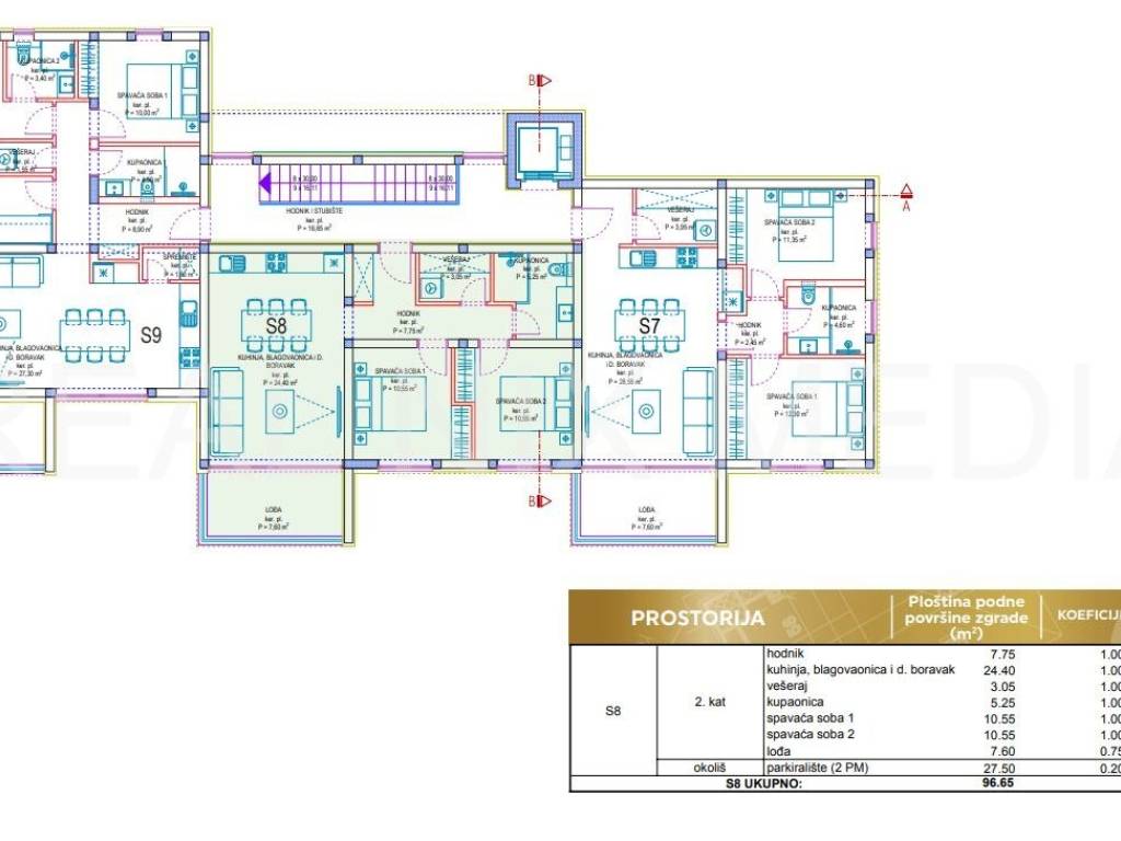 Predmetni stan oznake S8 nalazi se na drugom katu zgrade te se sastoji od kuhinje, blagovaonice i dnevnog boravka sa izlazom na loggiu, hodnika, dvije spavaće sobe, kupaonice i vešeraja. Stanu pripadaju dva vanjska parkirna mjesta.