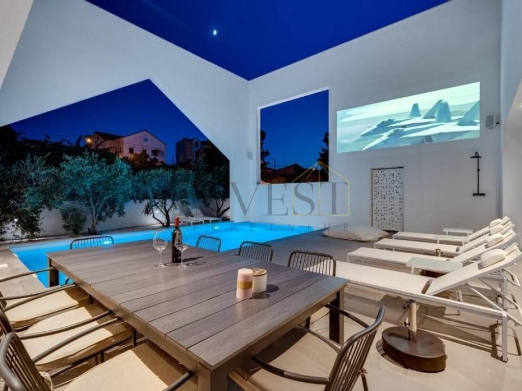 Vila također nudi luksuzne pogodnosti poput finske saune, WC-a i tuša u wellness dijelu, vanjskog grijanog bazena te prostora za zabavu na otvorenom koji uključuje kino pod zvijezdama, roštilj i vanjsku blagovaonicu s sunčalištem. Ova kombinacija unutarnjih i vanjskih prostora čini je savršenim mjestom za uživanje u životu na otvorenom.