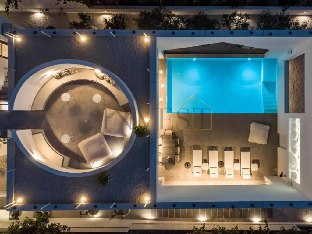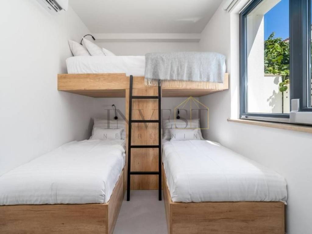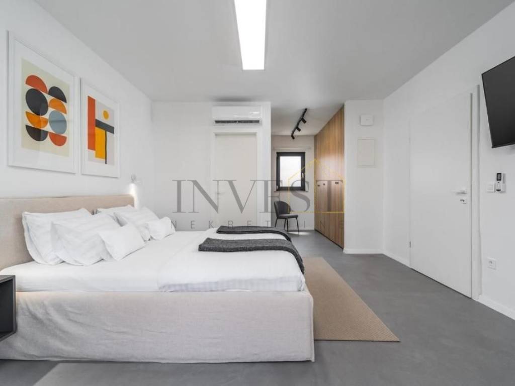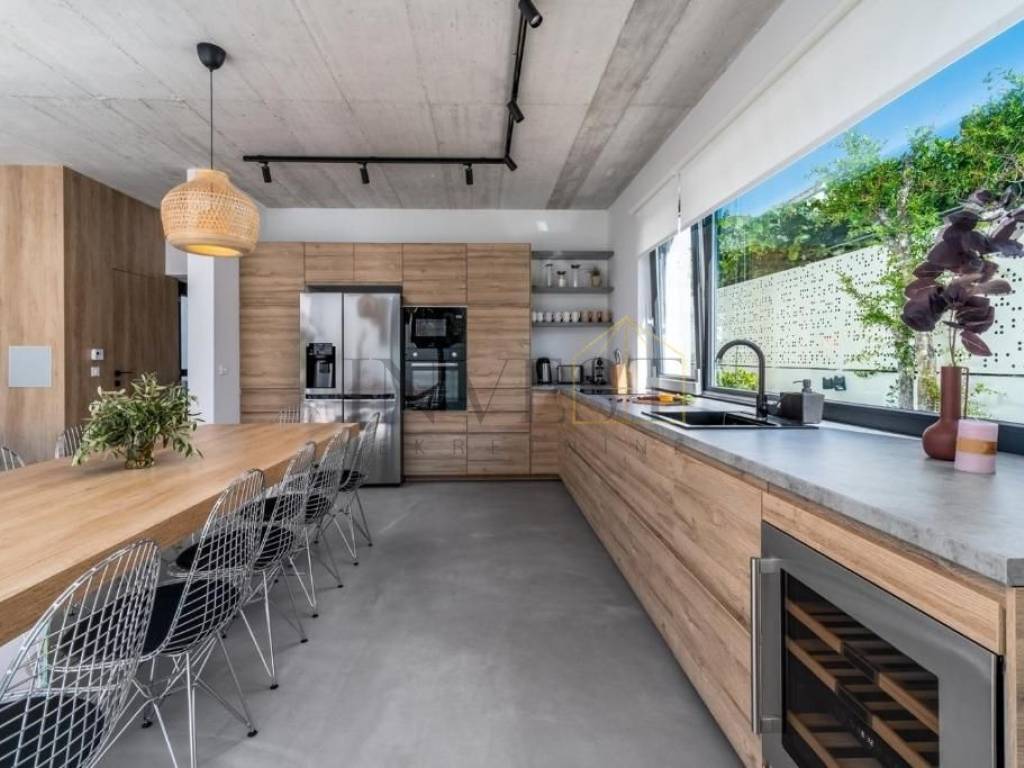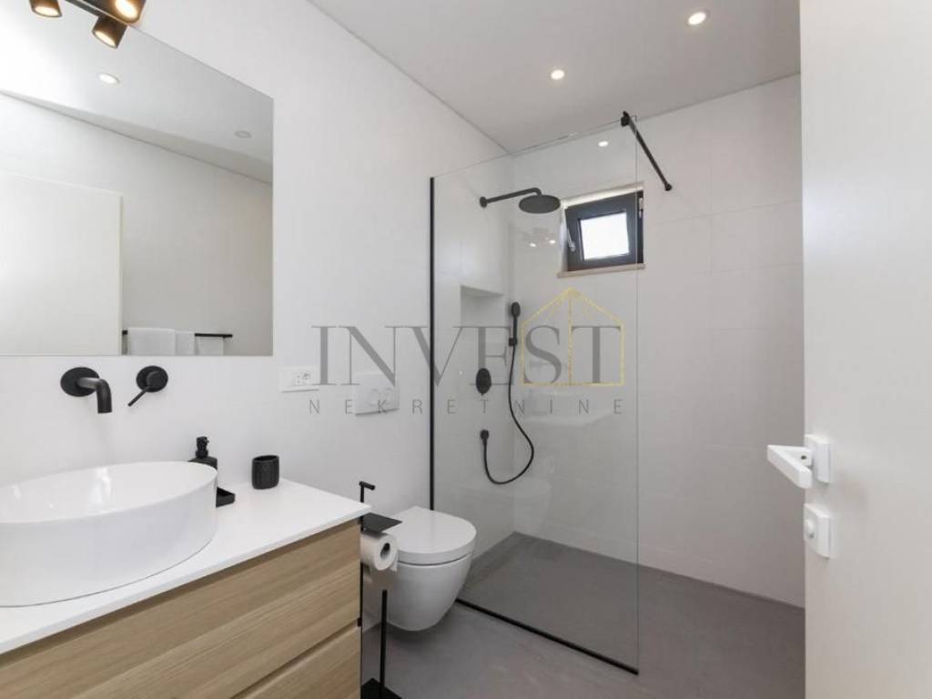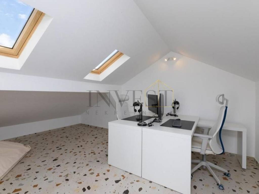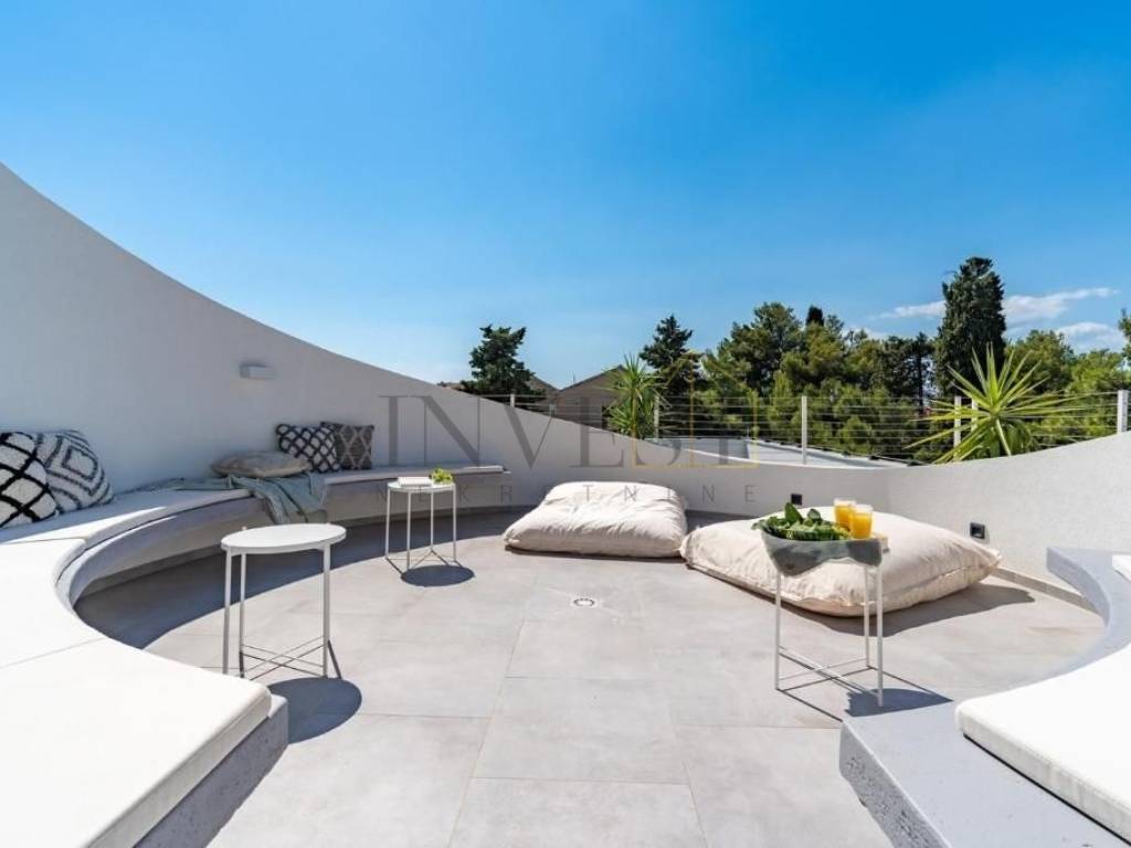 Uz svoj zanimljiv dizajn, vila nudi pet prostranih spavaćih soba, od kojih svaka ima svoju en suite kupaonicu, stvarajući intiman i udoban prostor za odmor i opuštanje. Osim toga, prostor je oblikovan kao otvoreni koncept, uključujući kuhinju, blagovaonicu i dnevni boravak koji zajedno stvaraju prostranu i funkcionalnu atmosferu. Na potkrovlju se nalazi uredski prostor površine 25 m2, idealan za rad od kuće ili privatne poslovne aktivnosti.