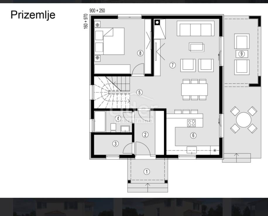 Kuća se nalazi na uzdignutom položaju te ima trajni pogled na more iz prizemlja.