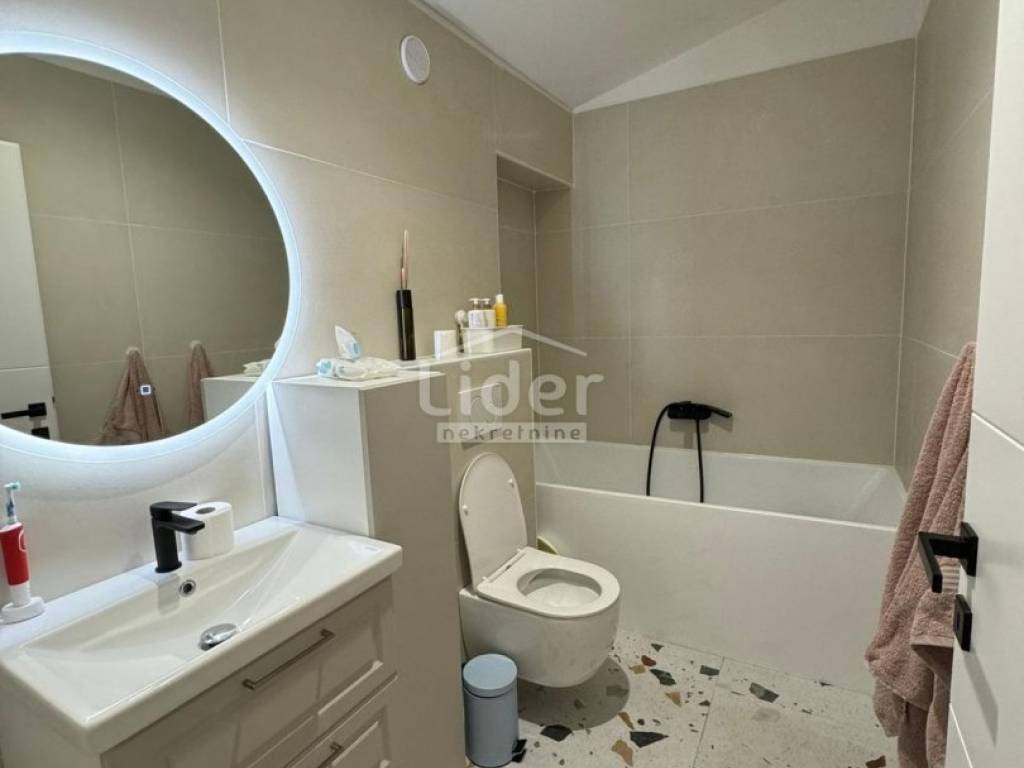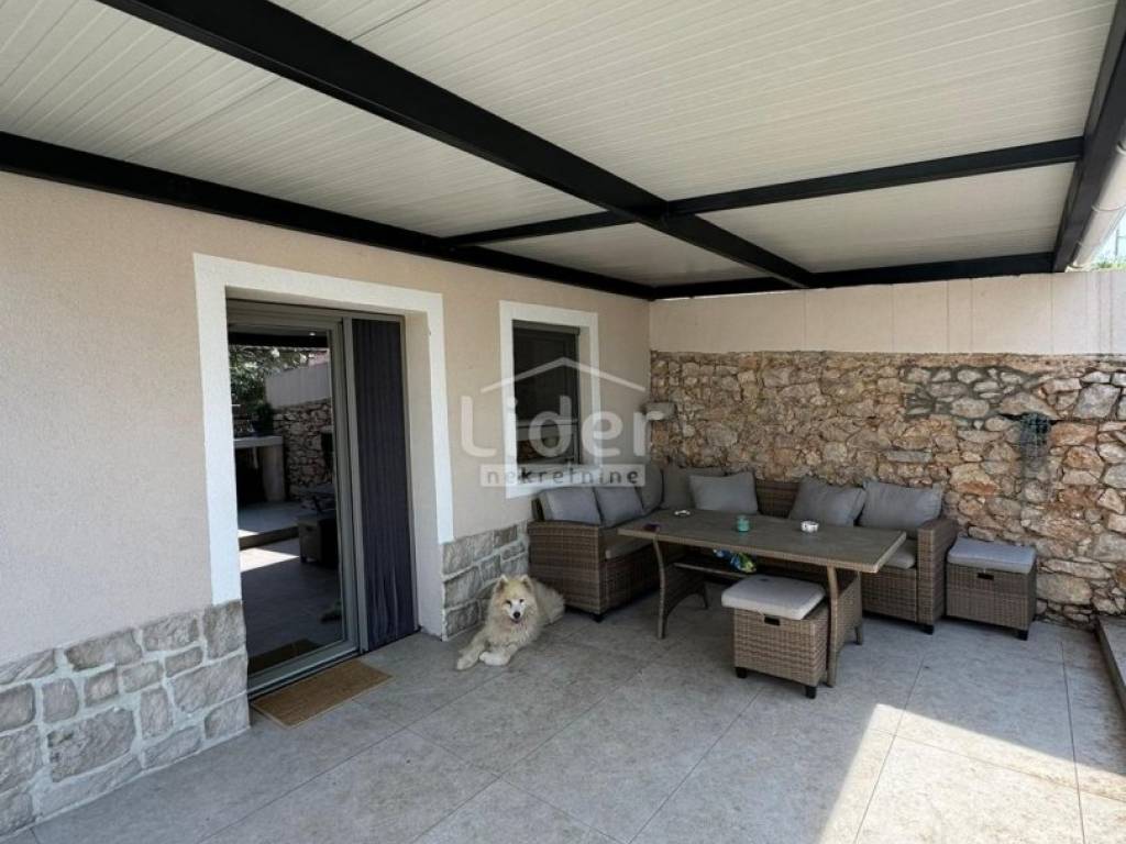 U prizemlju se nalazi dnevni boravak s kuhinjom i blagovaonom,vešeraj, sanitarni čvor, konoba za druženje i stepenište koje vodi do kata gdje su tri spavaće sobe,garderoba i dvije kupaonice.