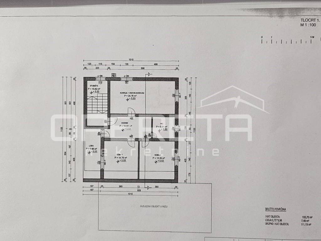 Na parceli ukupne površine 221 m2, nalazi se kuća ukupne bruto površine 380 m2 te dvorište i vrt ukupne površine 110 m2. U dvorištu se nalazi i pomoćna zgrada-garaža površine 21 m2, a osiguran je i nesmetan pristup automobilom.