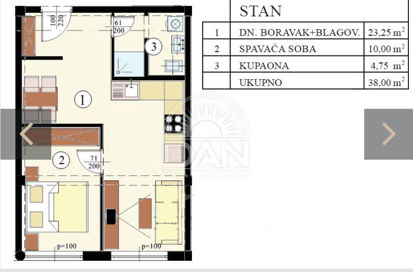 Stan se sastoji od hodnika, kupaonice, spavaće sobe te open space dnevnog dijela koji povezuje kuhinju, blagovaonicu i dnevni boravak. Zahvaljujući velikim otvorima, prostor je pun prirodnog svjetla i odiše toplinom i prozračnošću.