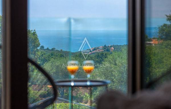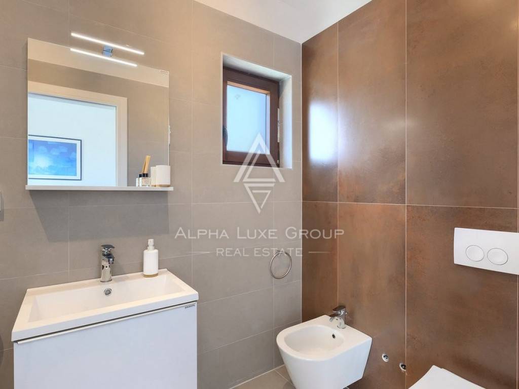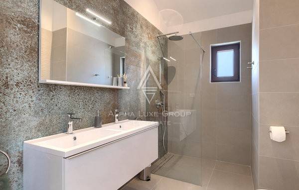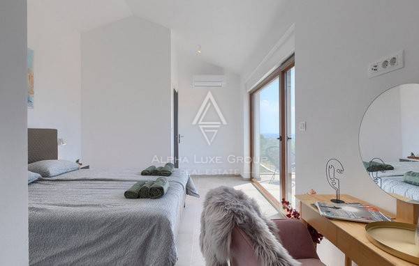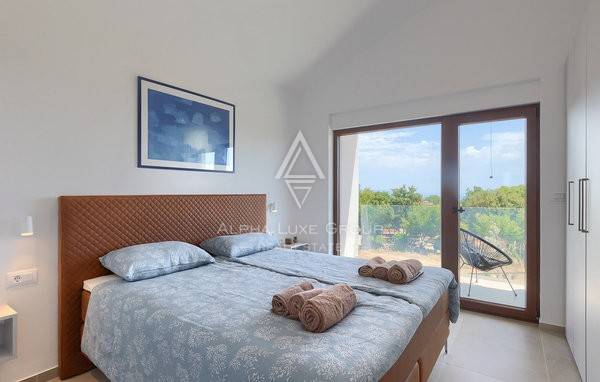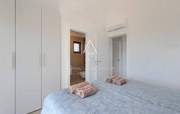 Na katu se nalaze dvije elegantne spavaće sobe, svaka sa svojom kupaonicom i privatnom terasom koja pruža romantičan pogled na more i obližnje otoke. Vila je opremljena podnim grijanjem i klimatizacijom, a visokokvalitetna talijanska keramika i drvene stepenice dodatno naglašavaju profinjen ambijent. Prizemlje također uključuje kupaonicu i spremište za dodatnu praktičnost.