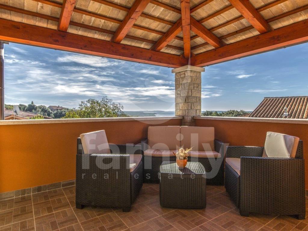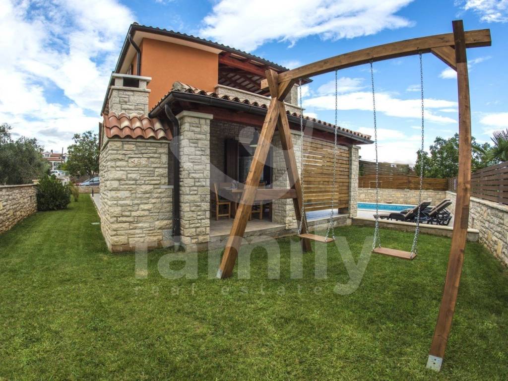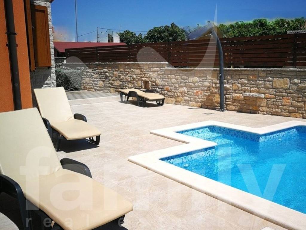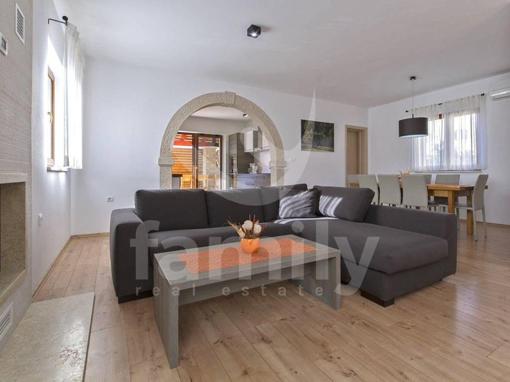 Nedaleko od centra Vodnjana i mora, u mirnom naselju zvanom Barbariga se smjestila navedena kvalitetna, obiteljska kuća sa stambenom površinom od 196 m2 i okućnicom od 460 m2. Kuća se proteže na dvije etaže, prizemlje gdje se nalazi ulazni predprostor, gostinjski toalet, prostrani i osvjetljeni dnevni boravak sa prostorom za ručavanje i kuhinjom kroz koju je omogućen izlazak na terasu popločanu kamenom i opremljenom vanjskim ugradbenim kaminom sa istarskom grotom i stolom za ručavanje za 6 osoba, kotlovnicom, bazenom sa sunčalištem kao i vanjskim tušem. Druga etaža odnosno prvi kat se sastoji od tri komforne spavaće sobe svaka sa svojom kupaonicom s tim da dvije spavaće sobe posjeduju izlaz na terasu sa koje se pruža predivan pogled na more. Kuća je opremljena PVC stolarijom, podovi su obloženi kvalitetnim parketom kao i keramikom dok je sustav grijanja i hlađenja u cijelom objektu reguliran putem 4 jedinice klima uređaja. Nekretnina je također opremljena solarnim grijanjem koje osigurava toplu vodu za bojler obujma 500 L. Parkirna mjesta su osigurana nadstrešnicom s dva natkrivena parkirna mjesta, dok su dodatna dva parkirna mjesta dostupna na nenatkrivenom dijelu.