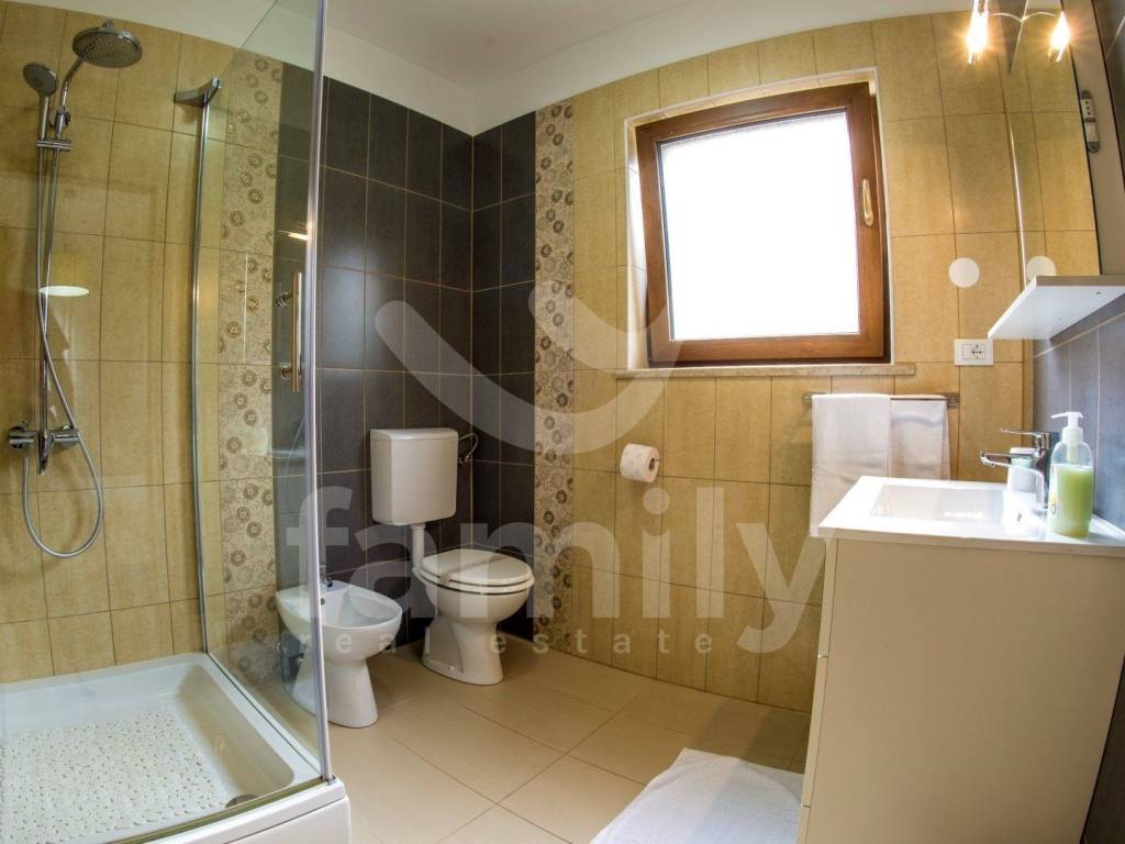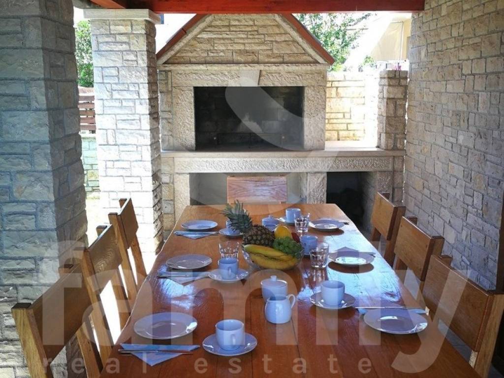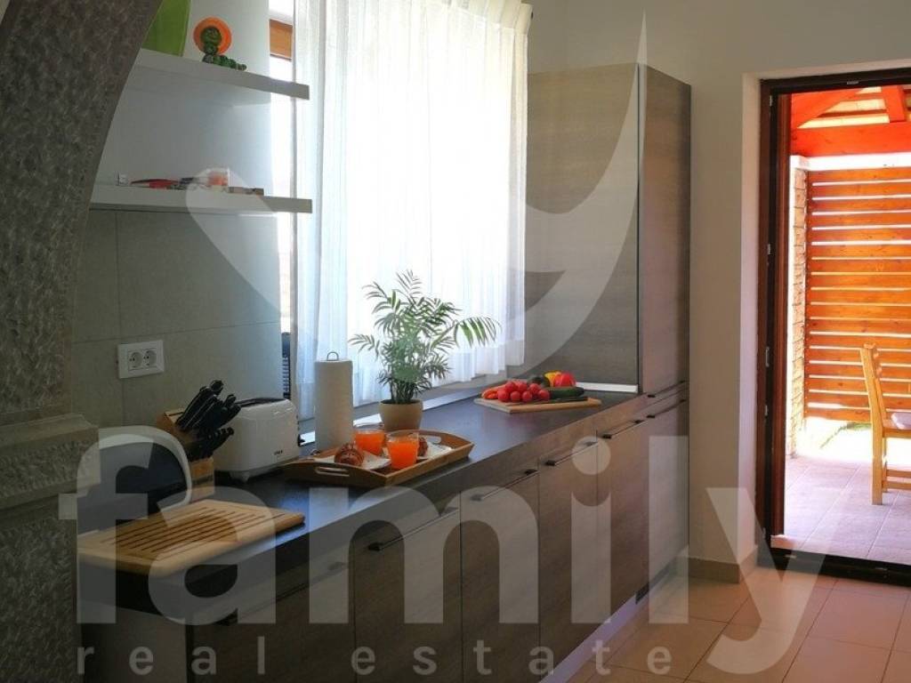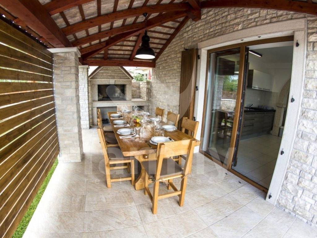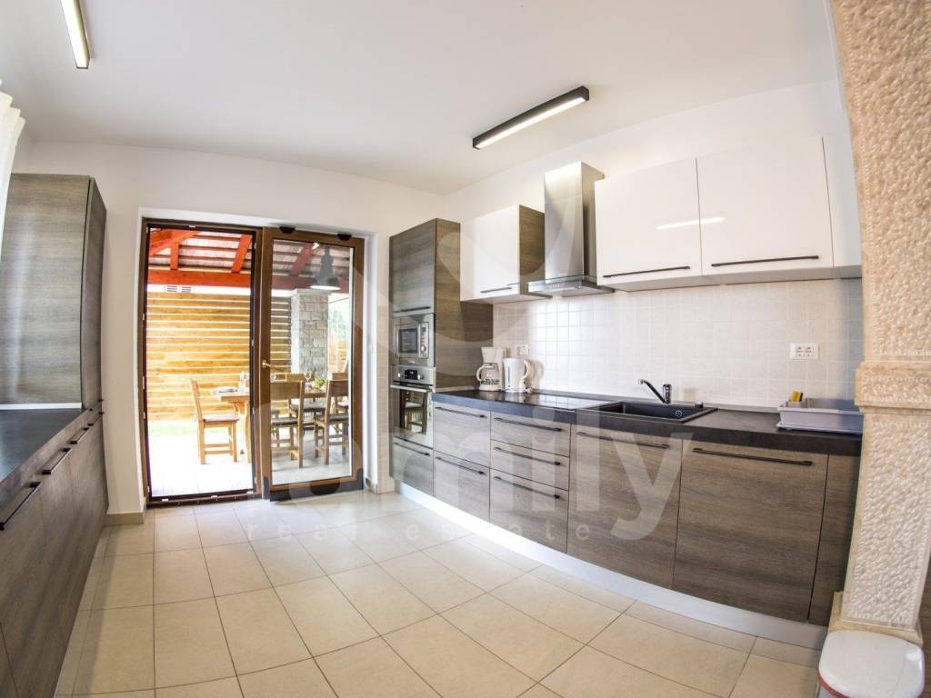 Nedaleko od centra Vodnjana i mora, u mirnom naselju zvanom Barbariga se smjestila navedena kvalitetna, obiteljska kuća sa stambenom površinom od 196 m2 i okućnicom od 460 m2. Kuća se proteže na dvije etaže, prizemlje gdje se nalazi ulazni predprostor, gostinjski toalet, prostrani i osvjetljeni dnevni boravak sa prostorom za ručavanje i kuhinjom kroz koju je omogućen izlazak na terasu popločanu kamenom i opremljenom vanjskim ugradbenim kaminom sa istarskom grotom i stolom za ručavanje za 6 osoba, kotlovnicom, bazenom sa sunčalištem kao i vanjskim tušem. Druga etaža odnosno prvi kat se sastoji od tri komforne spavaće sobe svaka sa svojom kupaonicom s tim da dvije spavaće sobe posjeduju izlaz na terasu sa koje se pruža predivan pogled na more. Kuća je opremljena PVC stolarijom, podovi su obloženi kvalitetnim parketom kao i keramikom dok je sustav grijanja i hlađenja u cijelom objektu reguliran putem 4 jedinice klima uređaja. Nekretnina je također opremljena solarnim grijanjem koje osigurava toplu vodu za bojler obujma 500 L. Parkirna mjesta su osigurana nadstrešnicom s dva natkrivena parkirna mjesta, dok su dodatna dva parkirna mjesta dostupna na nenatkrivenom dijelu.