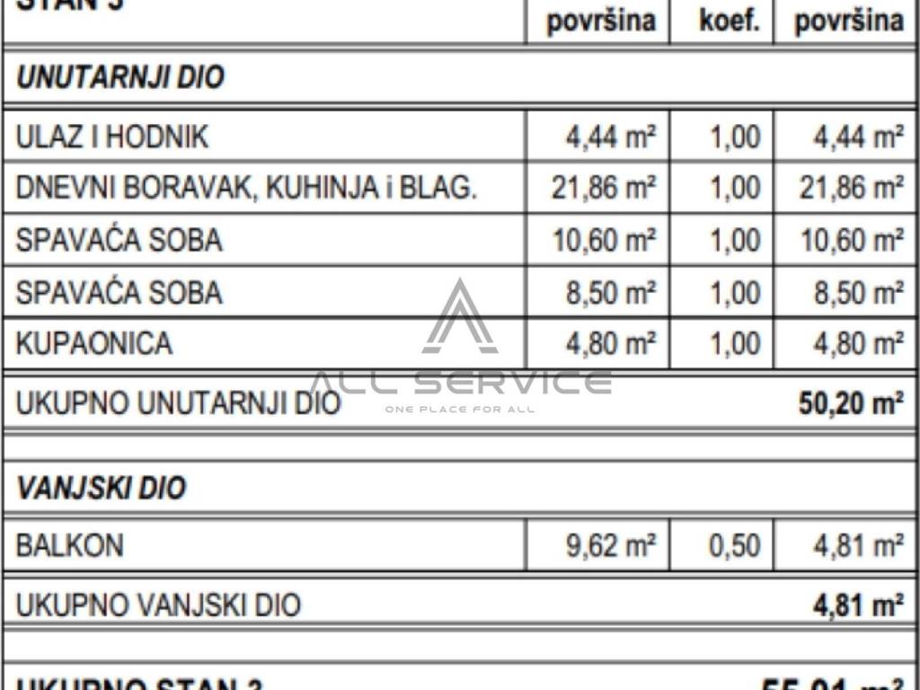 Ukupna površina stana iznosi 55 m2, sastoji se od dvije spavaće sobe, ulaznog prostora s hodnikom, kupaonice te dnevnog boravka s kuhinjom i blagovaonicom.