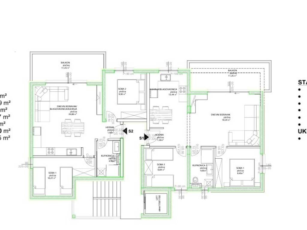 Stan S2 prizemlje se sastoji od dvije spavaće sobe, kupatila, hodnika, kuhinje i dnevnog boravka te balkona.