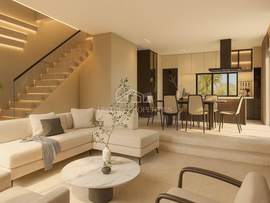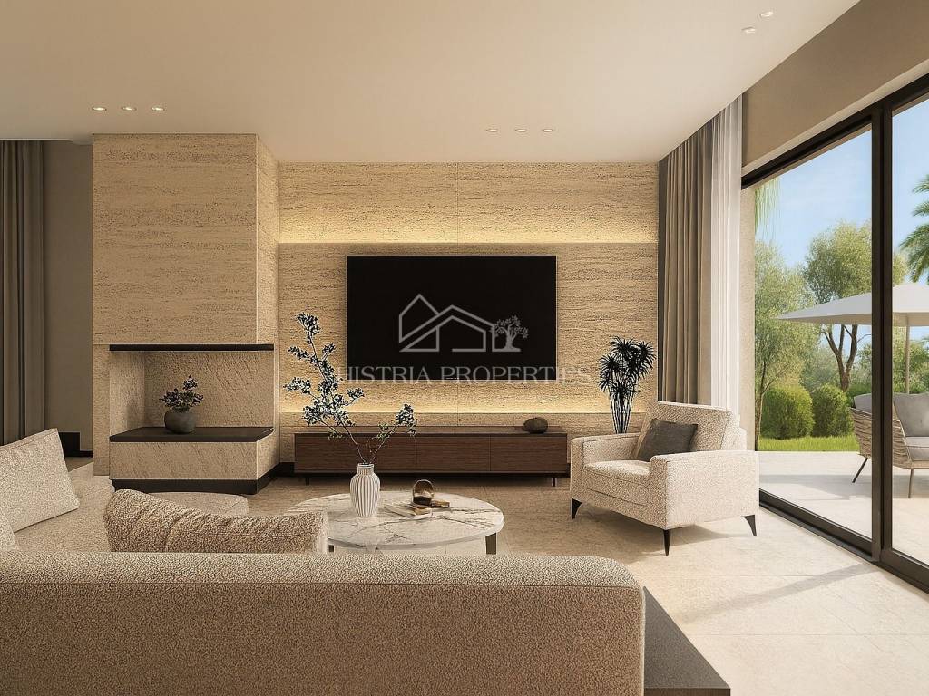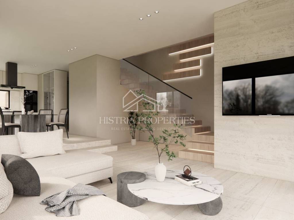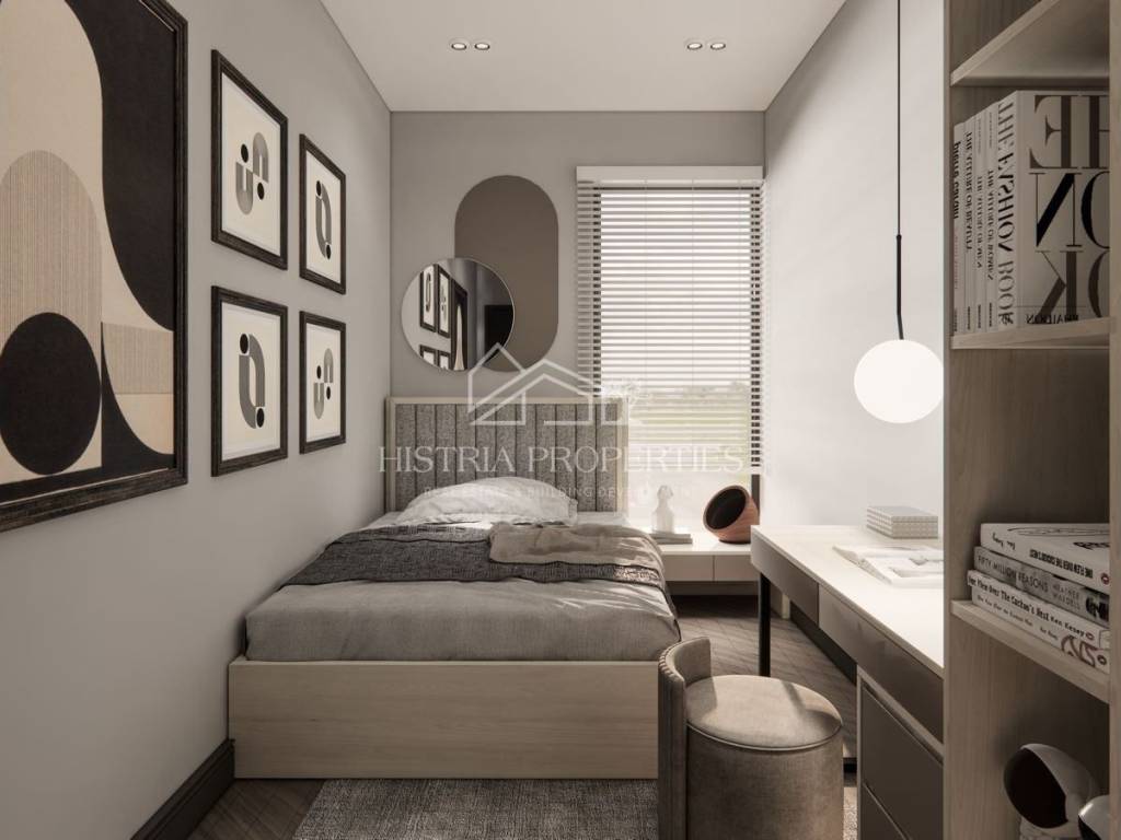 U prizemlju se nalazi prostrani dnevni boravak povezan s modernom kuhinjom i blagovaonicom otvorenog prostora idealan za obiteljski život i ugodna druženja. Prozori od poda do stropa uokviruju prekrasan pogled ispunjen mnoštvom prirodne svjetlosti. Na ovoj etaži se smjestio još zasebni toalet i praktična ostava/praonica. Na katu imamo 3 iznimno udobne spavaće sobe od kojih su dvije sa en-suite kupaonicama uz još jednu dodatnu kupaonicu što osigurava privatnost svim stanarima. Glavna spavaća soba nudi prekrasan pogled na more uz svakodnevna očaravajuća buđenja. Vanjski prostor je elegantno uređen sa centralnim bazenom od 45m2 za ljetno uživanje uz još jedno dodatno spremište.