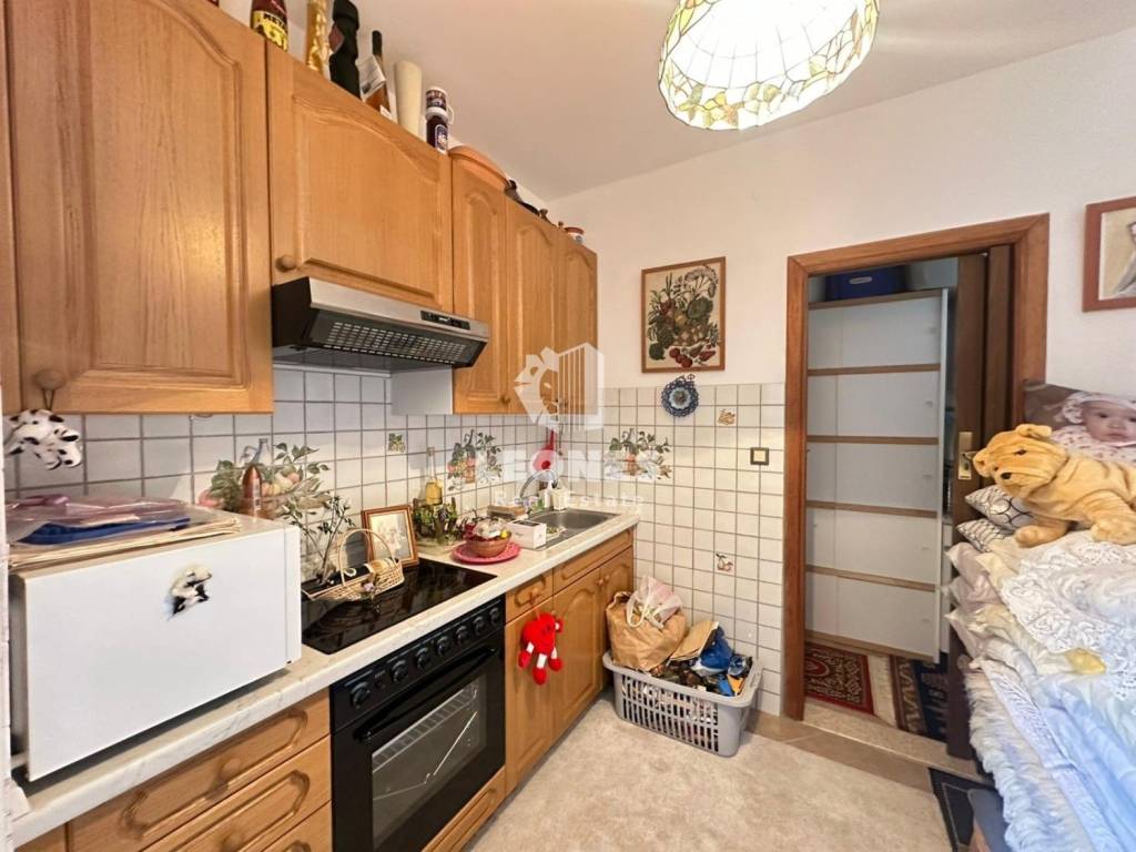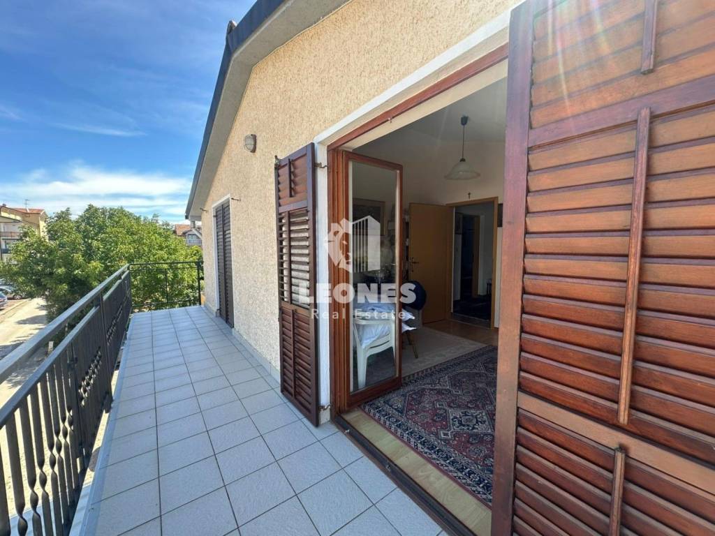 Vanjskim se stepenicama penjemo na stan na prvom katu koji se sastoji od dvije spavaće sobe, nekorištene kuhinje s blagovanicom, kupatila te prostrane terase .
