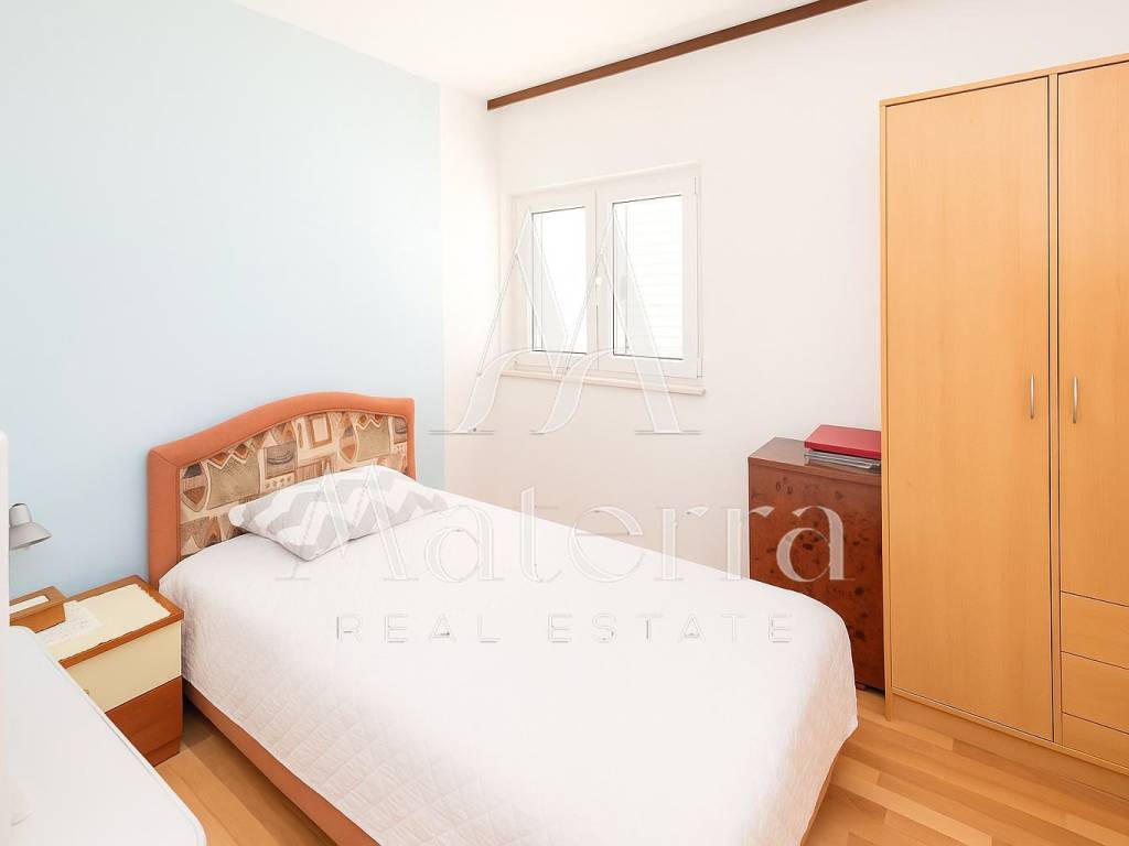 82 m² stambeno (105 m² neto) 3 spavaće sobe Dnevni boravak s blagovaonicom i kuhinjom Južni balkon cijelom dužinom – pogled na more Vlastito vanjsko stubište i dio vrta Potpuno namješten, useljiv Energetski razred D