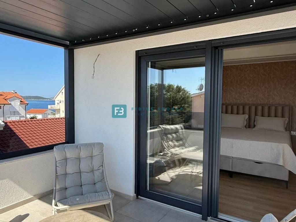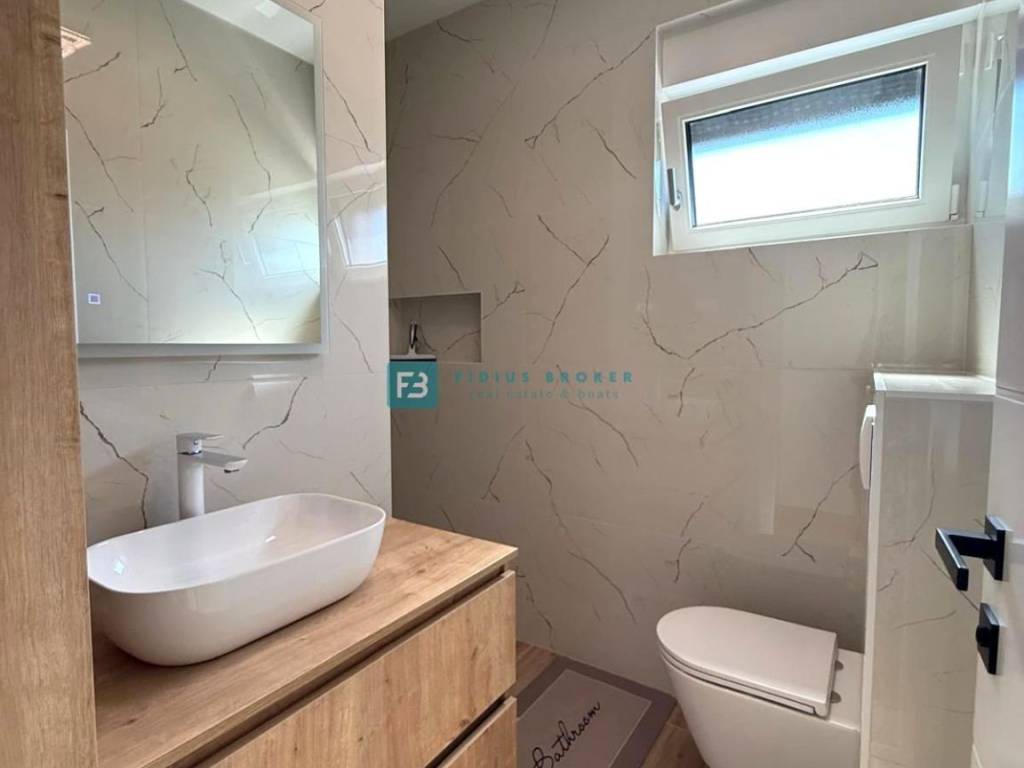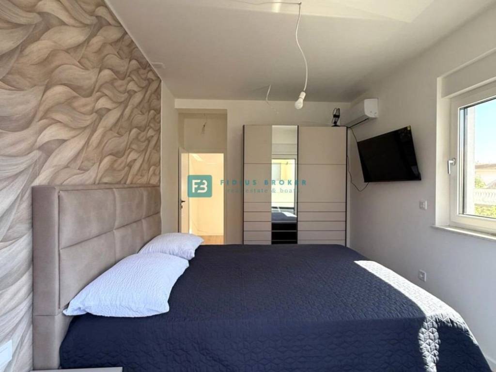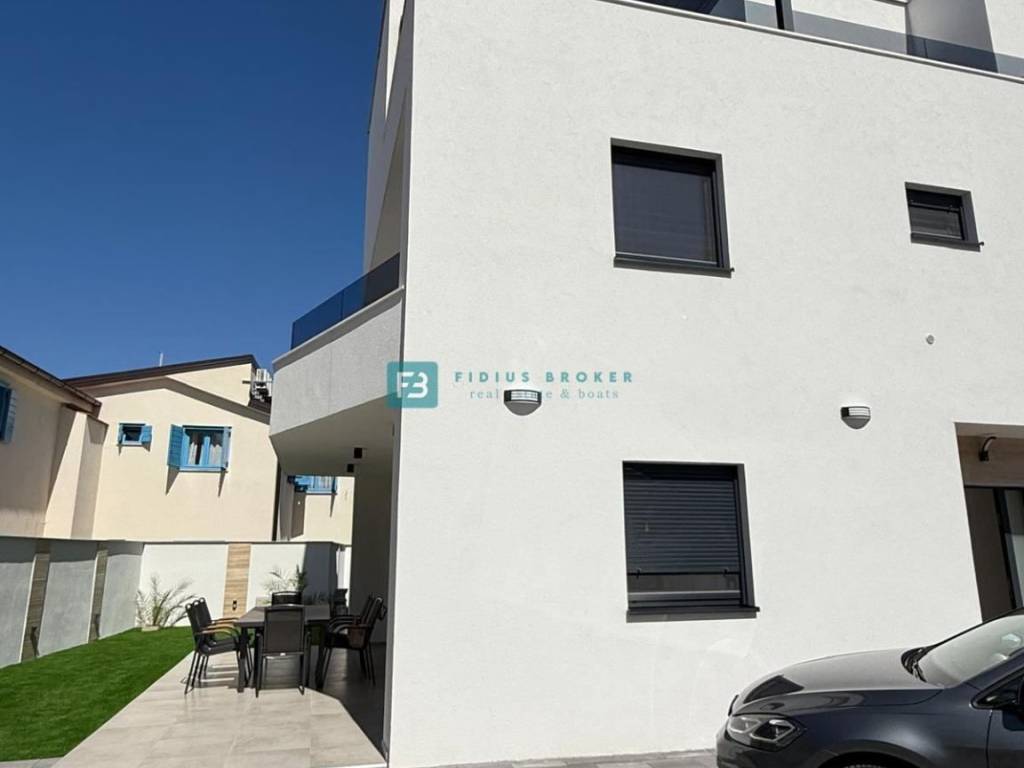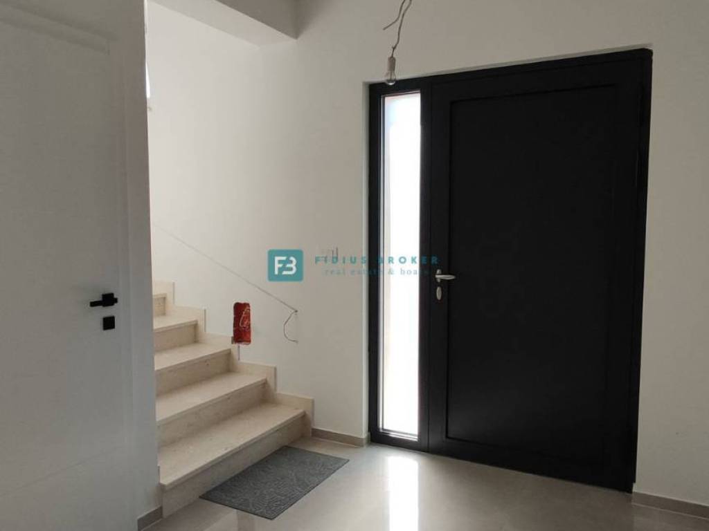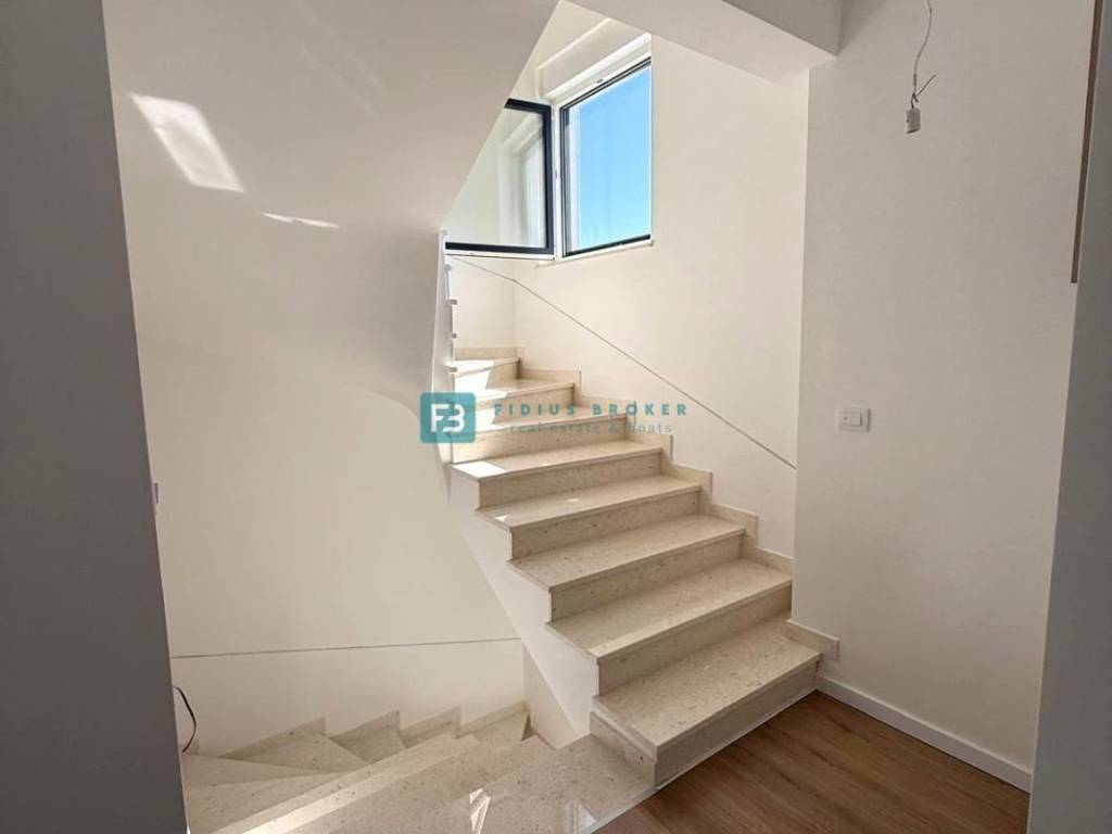 Moderan projekt, atraktivnog dizajna s pogledom na more. Za gradnju su korišteni kvalitetni materijali te je ugrađena vrhunska oprema: stiropor fasada 10 cm, protuprovalna i protupožarna ulazna vrata, ALU stolarija, podizno klizne stijene, električne rolete, ugrađeni komarnici, podno vodeno grijanje kroz cijelu kuću (grijanje putem TOPLOTNE PUMPE, priprema za fotonaponske ćelije i solarne panele, klima uređaj u svakoj prostoriji, moderne sanitarije u kupaonicama, visokokvalitetne keramičke podne obloge, kvalitetan laminat u spavaćim sobama, staklena ograda, stubište obloženo mramorom, crna metalna ograda u stubištu, električne pergole na terasama. Kuća je završena i useljiva.