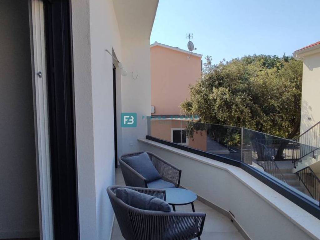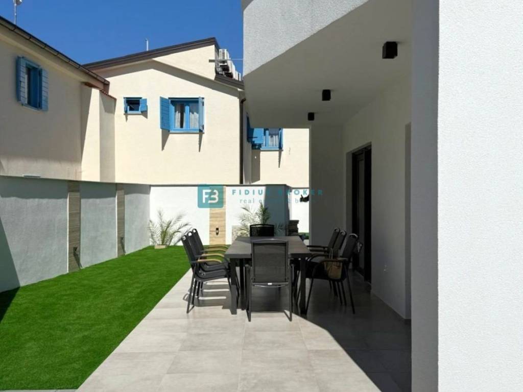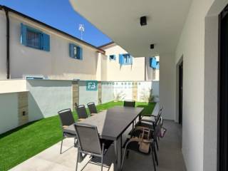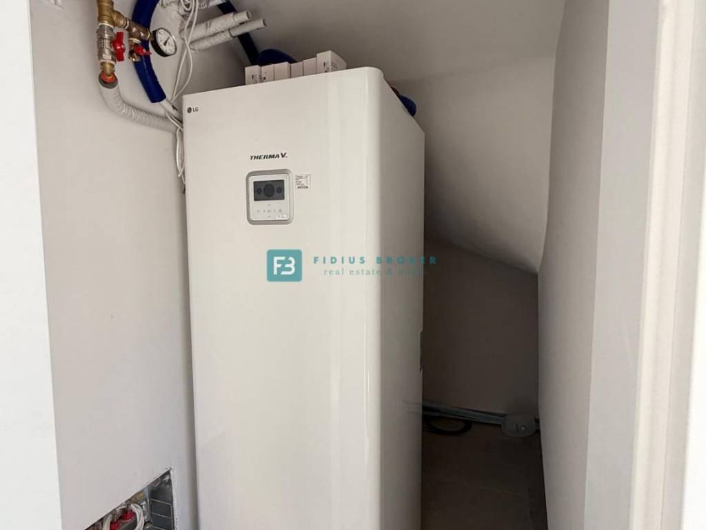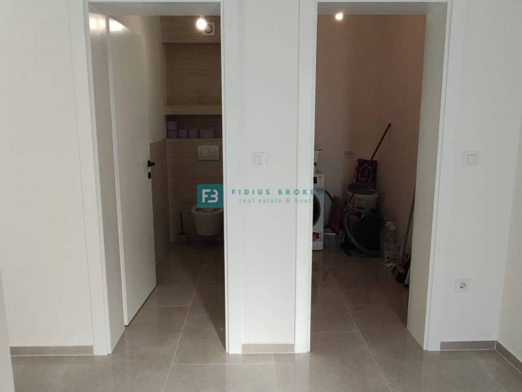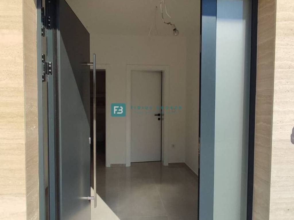 Moderan projekt, atraktivnog dizajna s pogledom na more. Za gradnju su korišteni kvalitetni materijali te je ugrađena vrhunska oprema: stiropor fasada 10 cm, protuprovalna i protupožarna ulazna vrata, ALU stolarija, podizno klizne stijene, električne rolete, ugrađeni komarnici, podno vodeno grijanje kroz cijelu kuću (grijanje putem TOPLOTNE PUMPE, priprema za fotonaponske ćelije i solarne panele, klima uređaj u svakoj prostoriji, moderne sanitarije u kupaonicama, visokokvalitetne keramičke podne obloge, kvalitetan laminat u spavaćim sobama, staklena ograda, stubište obloženo mramorom, crna metalna ograda u stubištu, električne pergole na terasama. Kuća je završena i useljiva.