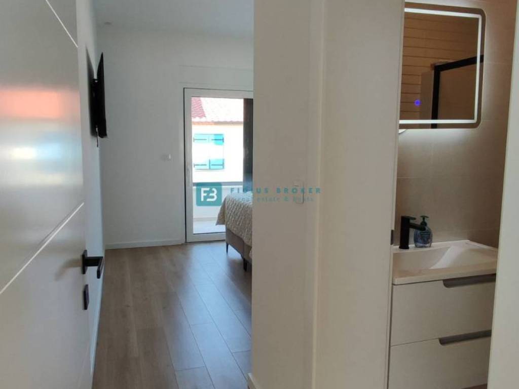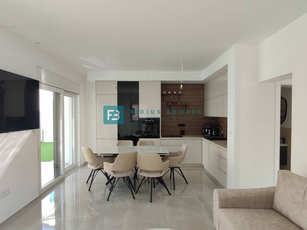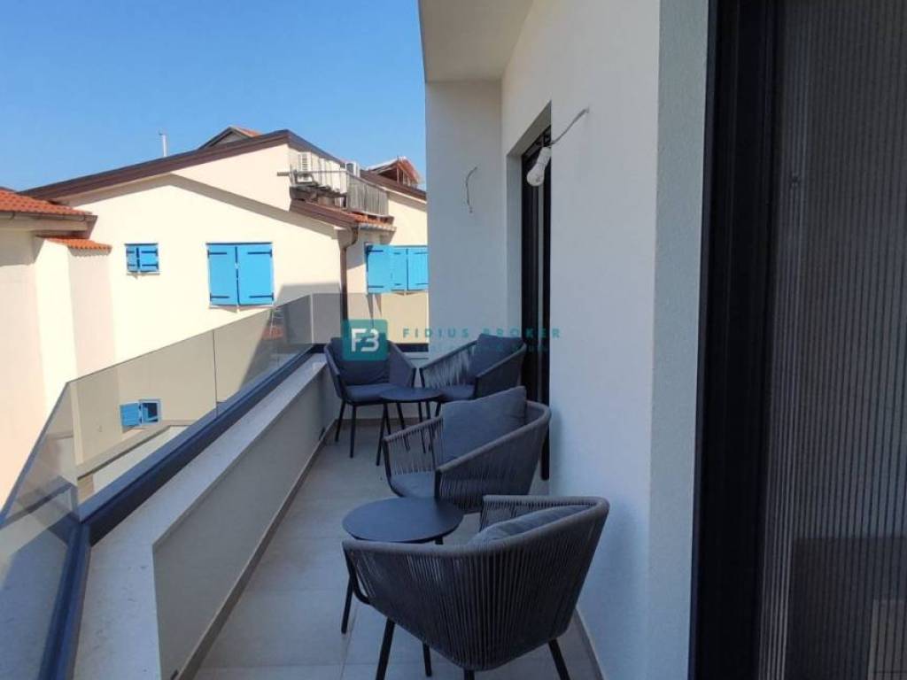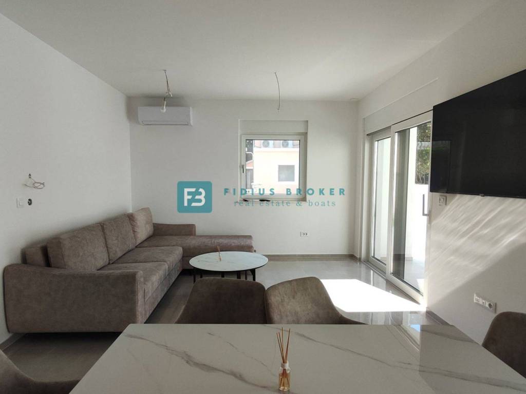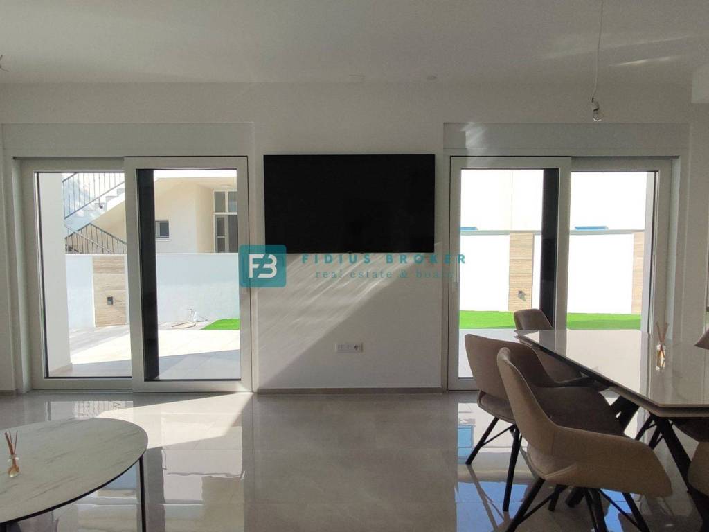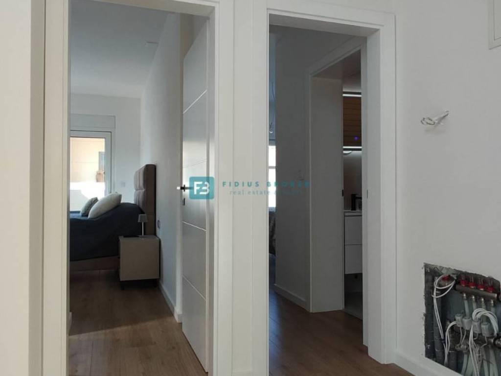 Moderan projekt, atraktivnog dizajna s pogledom na more. Za gradnju su korišteni kvalitetni materijali te je ugrađena vrhunska oprema: stiropor fasada 10 cm, protuprovalna i protupožarna ulazna vrata, ALU stolarija, podizno klizne stijene, električne rolete, ugrađeni komarnici, podno vodeno grijanje kroz cijelu kuću (grijanje putem TOPLOTNE PUMPE, priprema za fotonaponske ćelije i solarne panele, klima uređaj u svakoj prostoriji, moderne sanitarije u kupaonicama, visokokvalitetne keramičke podne obloge, kvalitetan laminat u spavaćim sobama, staklena ograda, stubište obloženo mramorom, crna metalna ograda u stubištu, električne pergole na terasama. Kuća je završena i useljiva.