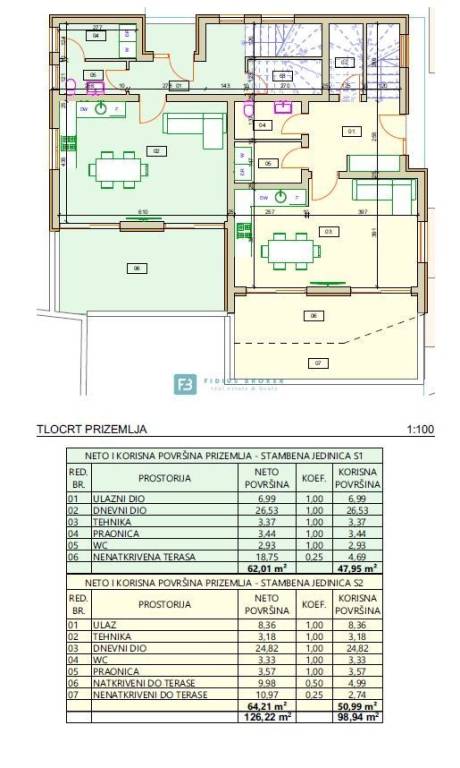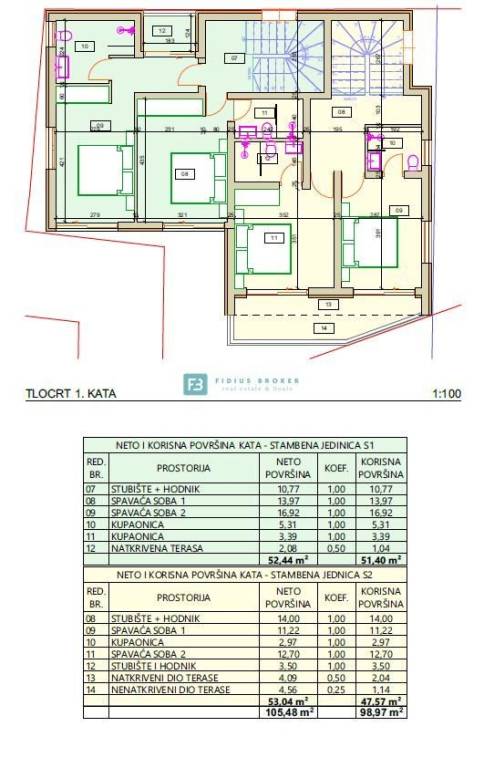 Kuća S1 neto korisne površine 163,43 m2 (stambena površina 124,56 m2 + terase 38,87 m2 + vrt + 2 parking mjesta) sastoji se od tri etaže: prizemlje + 1. kat + 2. kat. U prizemlju kuće nalazi se ulazni dio, ostava, praonica, WC, open space kuhinja s blagovaonicom i dnevnim boravkom koja ima izlaz na prostranu terasu površine 20,98 m2. Unutarnjim stubištem dolazi se na 1. kat gdje je hodnik, dvije spavaće sobe, svaka s vlastitom kupaonicom i terasa. Na 2. katu nalazi se hodnik, kupaonica, spavaća soba s izlazom na lijepu terasu površine 18,04 m2 s koje se pruža pogled na more. Kući pripada odgovarajući dio vrta i dva parkirna mjesta. Cijena iznosi 439.000 €.