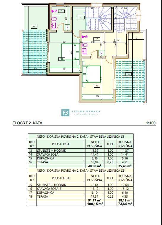 Kuća S2 neto korisne površine 168,42 m2 (stambena površina 121,51 m2 + terase 46,91 m2 + vrt + 2 parking mjesta) sastoji se od tri etaže: prizemlje + 1. kat + 2. kat. U prizemlju kuće nalazi se ulazni dio, ostava, praonica, WC, open space kuhinja s blagovaonicom i dnevnim boravkom koja ima izlaz na prostranu terasu površine 18,75 m2. Unutarnjim stubištem dolazi se na 1. kat gdje je hodnik, dvije spavaće sobe, svaka s vlastitom kupaonicom i zajedničkom terasom. Na 2. katu nalazi se hodnik, kupaonica, spavaća soba s izlazom na terasu površine 17,31 m2 s koje se pruža lijepi pogled na more. Kući pripada odgovarajući dio vrta i dva parkirna mjesta. Kuća je moderno uređena s pažnjom posvećenom svakom detalju, a na prodaju dolazi potpuno namještena i opremljena te je kao takva odmah useljiva.