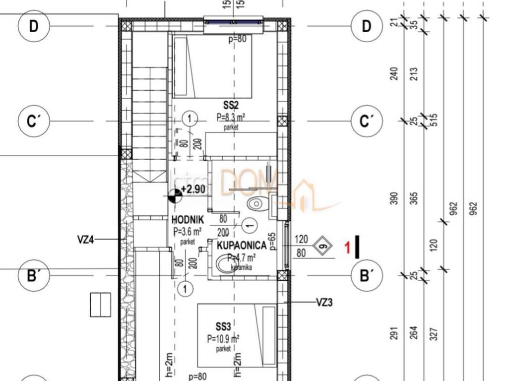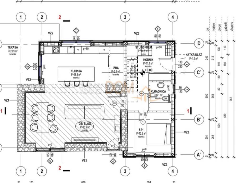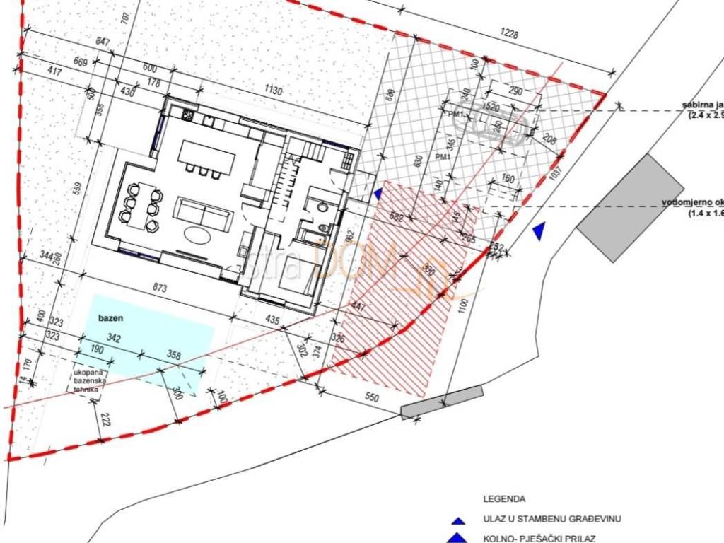 -Stambena površina: 125 m² (neto) -Okućnica: 614 m² -3 spavaće sobe -2 kupaonice -Open space kuhinja, blagovaonica i dnevni boravak (60 m²) -Visina stropa u dnevnom boravku i blagovaonici: 5 m -Bazen: 28 m² -Terasa: 24 m² -2 parkirna mjesta