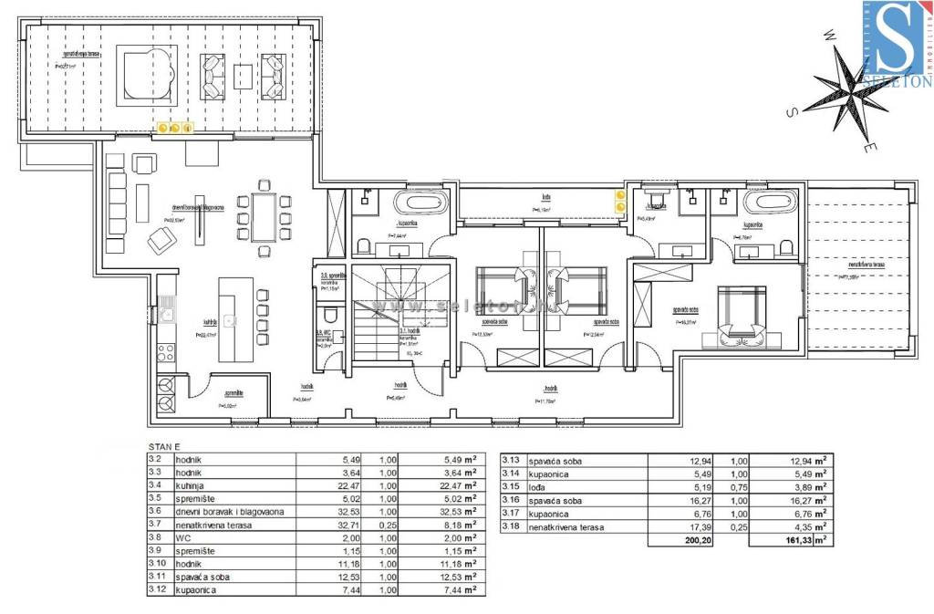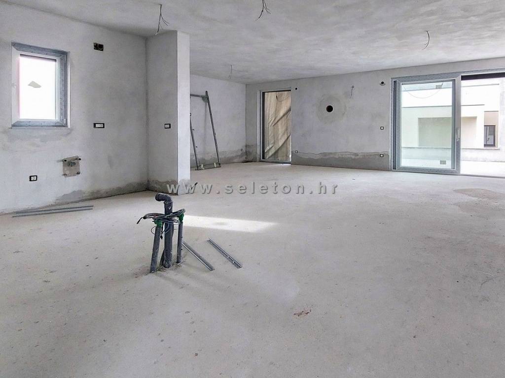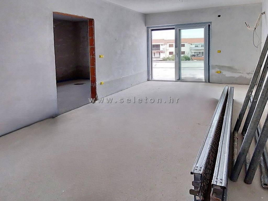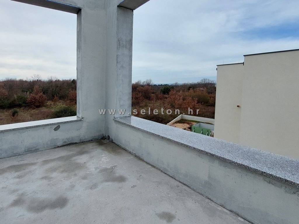 Poreč, u mirnom gradskom naselju prodaje se novi stan površine 161,54 m², sastoji se od dnevnog boravka, velike terase površine 32 m² s koje se pruža pogled na more, kuhinje, blagovaonice, 2 dodatne terase, hodnika, 3 spavaće sobe - svaka sa svojom kupaonicom i izlazom na terasu, ostave i WC-a. Stan se nalazi na drugom katu zgrade sa ukupno 5 stambenih jedinica, orijentiran je prema jugu što garantira puno prirodnog svijetla. Stan ima 4 klime marke Mitsubishi Electric ( u dnevnom boravku i u spavaćim sobama ), podno grijanje u cijelom stanu ( dizalica topline ), priprema tople sanitarne vode je također putem dizalice topline sa spremnikom od 175 litara, ima i protuprovalna ulazna vrata, PVC prozore s tri stakla, komarnicima i električnim roletama, pripadaju mu i dva parkirna mjesta ispred zgrade. Stan se nalazi u slijepoj ulici s malo prometa, udaljen je 500 m od stanice javnog gradskog prijevoza, te 1,5 km od mora/plaže i 3 km od centra Poreča.