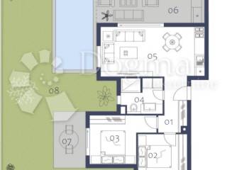 Stan u prizemlju odlikuje se funkcionalnim i prozračnim rasporedom prostora koji uključuje ulazni dio, dvije spavaće sobe, kupaonicu te otvoreni dnevni prostor s izlazom na terase. Posebnu vrijednost ovoj nekretnini daje prostrani privatni vrt površine više od 200 m s bazenom, koji pruža potpunu privatnost i idealne uvjete za boravak na otvorenom. Nekretnini pripada i jedno osigurano parkirno mjesto.