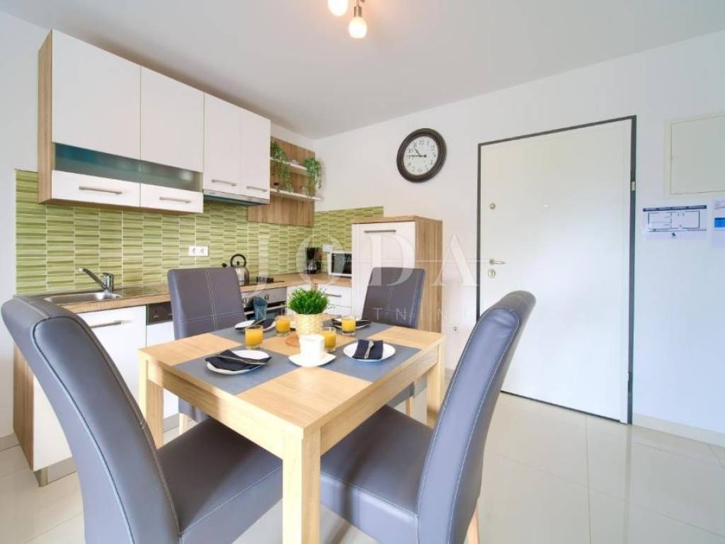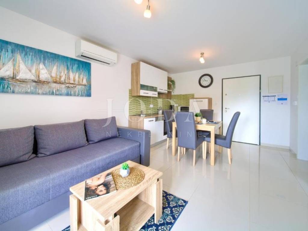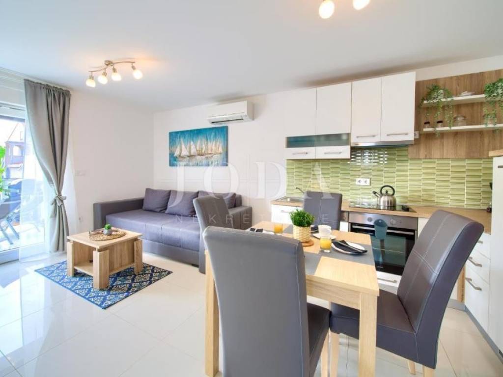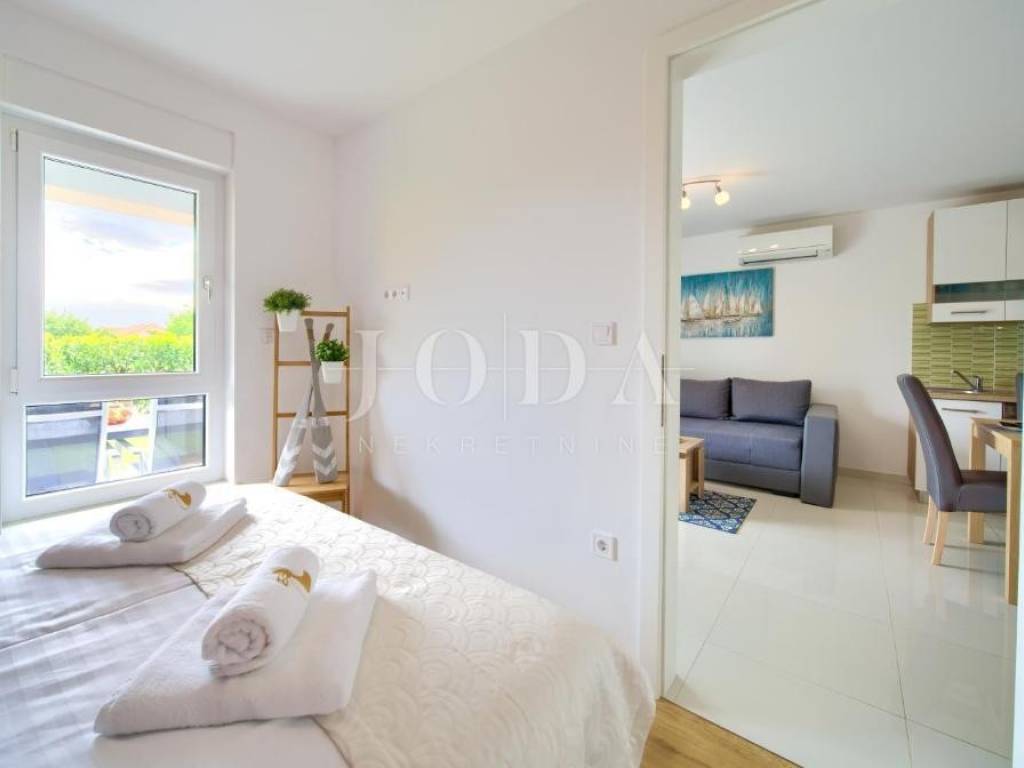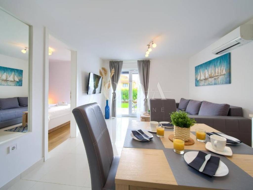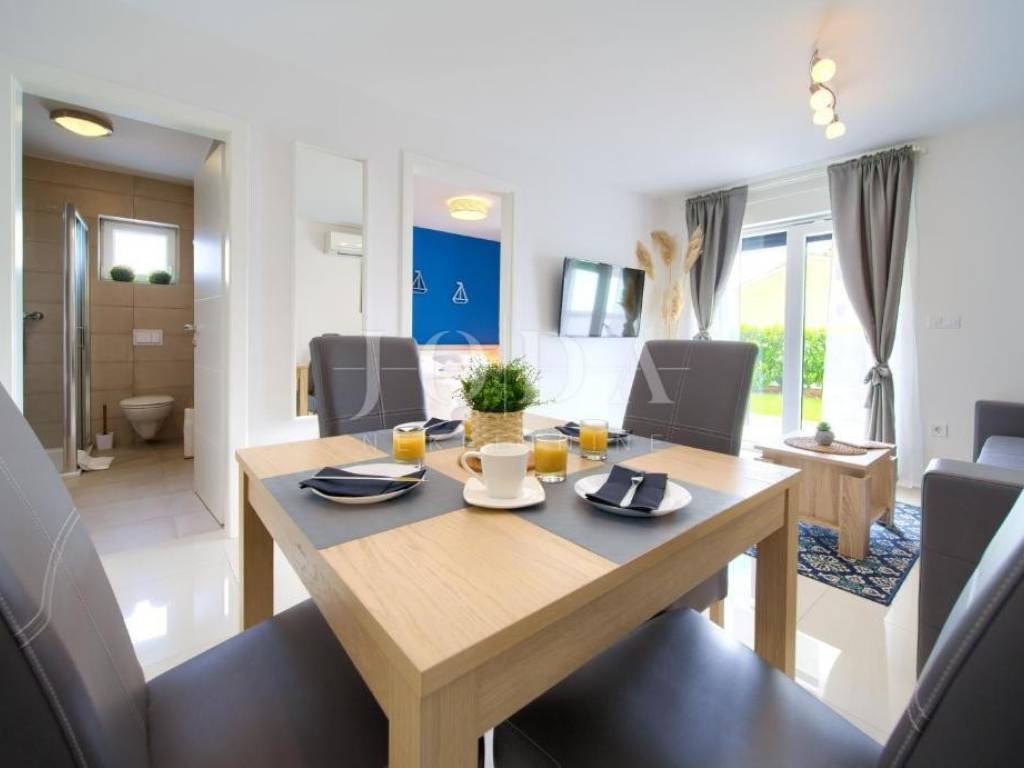 Stan u prizemlju površine je 33 m te se sastoji od dnevnog boravka, kuhinje s blagovaonicom, kupaonice i spavaće sobe. Ovom apartmanu pripada i okućnica površine 76 m.
