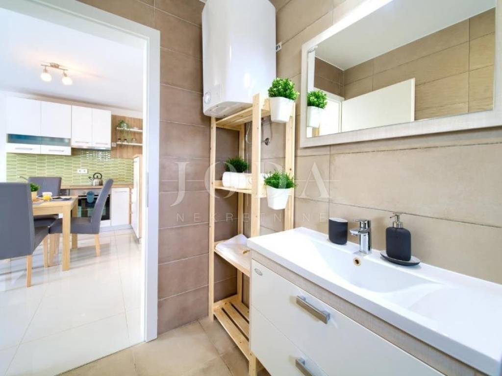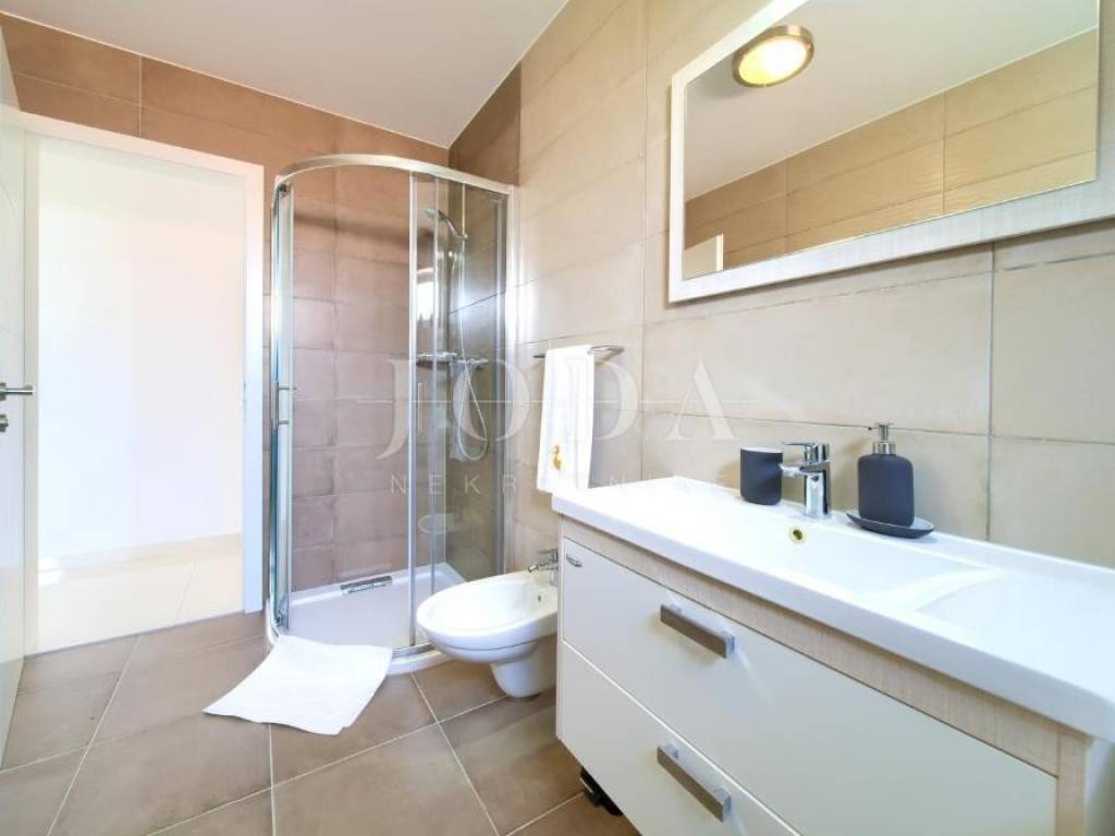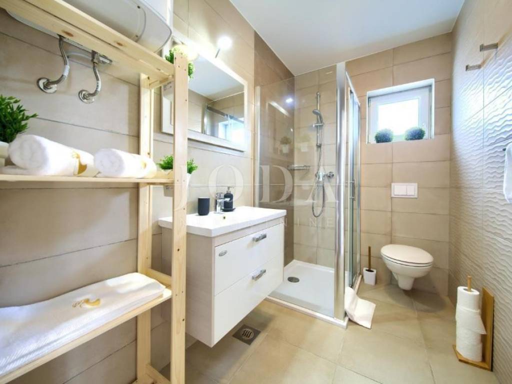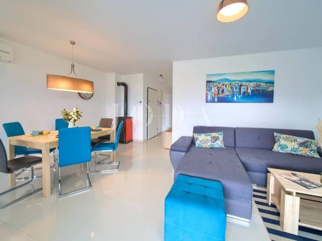 Na prvom katu nalazi se stan površine 70,68 m, koji obuhvaća dnevni boravak, kuhinju s blagovaonicom, dvije spavaće sobe, kupaonicu i terasu s lijepim pogledom.