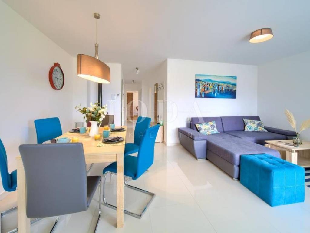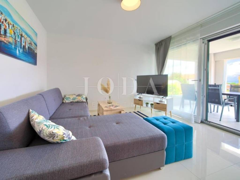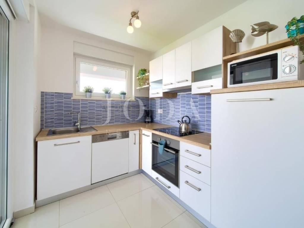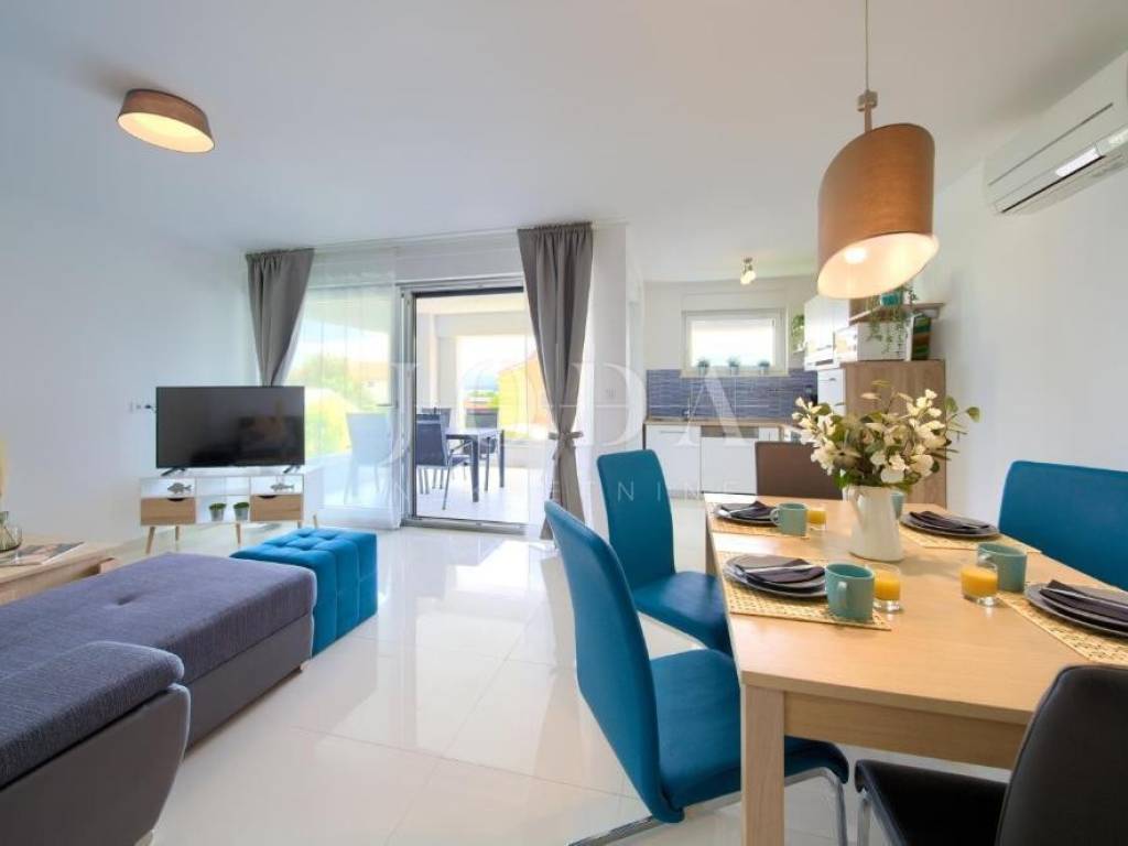 Na prvom katu nalazi se stan površine 70,68 m, koji obuhvaća dnevni boravak, kuhinju s blagovaonicom, dvije spavaće sobe, kupaonicu i terasu s lijepim pogledom.