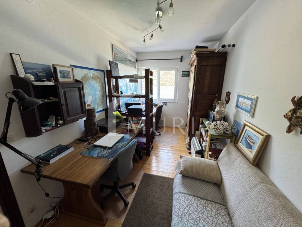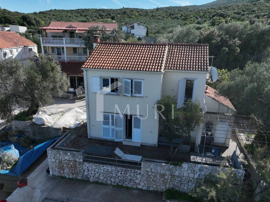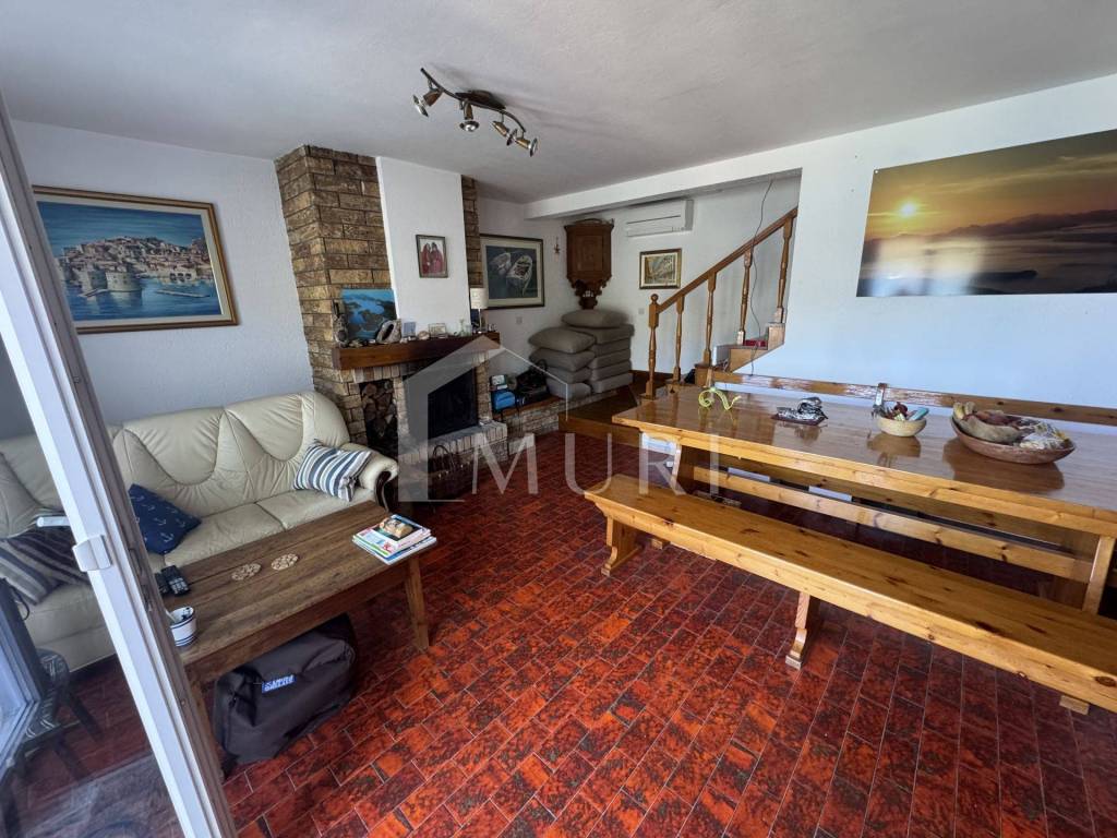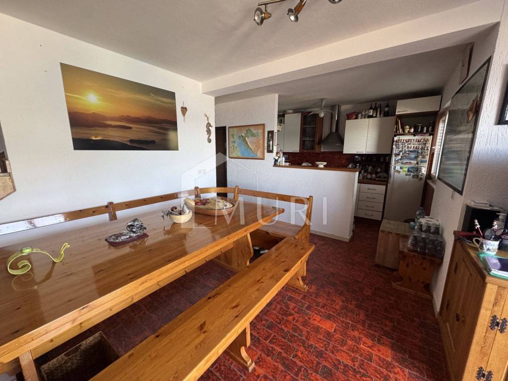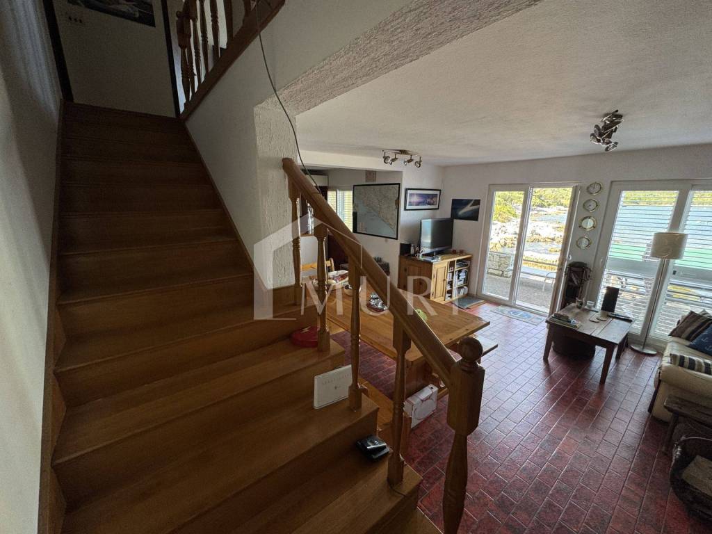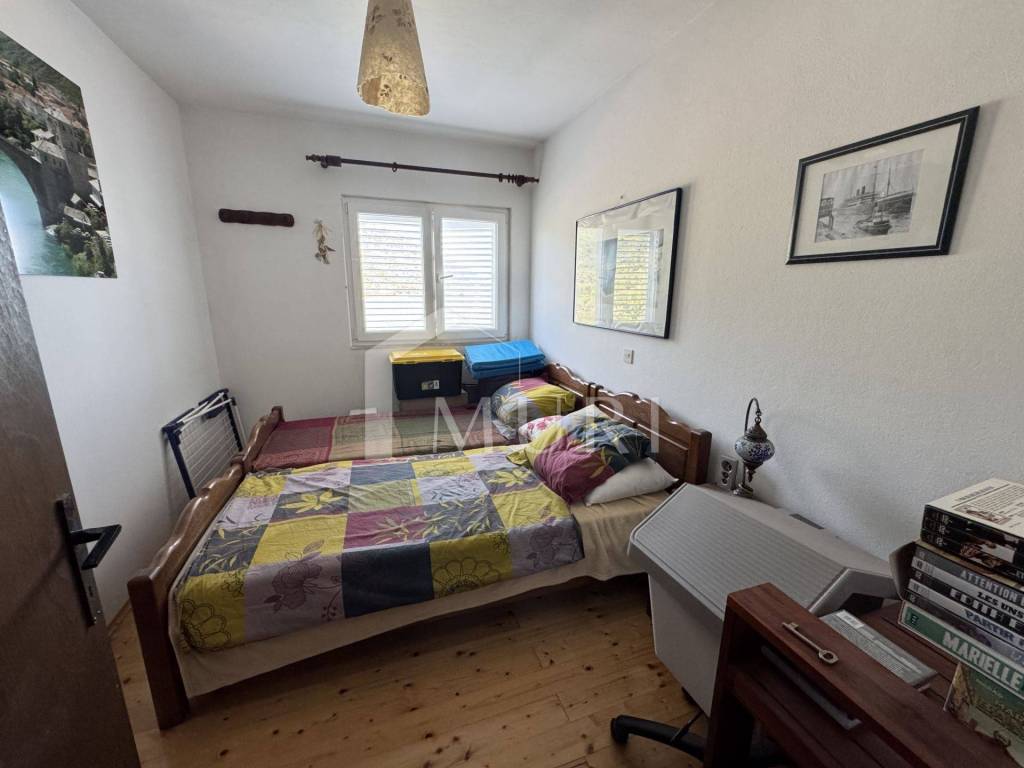Drveno stubište vodi na kat gdje se nalaze tri udobne spavaće sobe, a glavna soba ima izlaz na terasu s očaravajućim pogledom na more. Tu je i nova kupaonica, spremna za vaše trenutke opuštanja. Okućnica s dva mala vrta, ružama i maslinama, stvara osjećaj privatnog raja, dok natkriveno parkirno mjesto osigurava praktičnost svakodnevnog života.