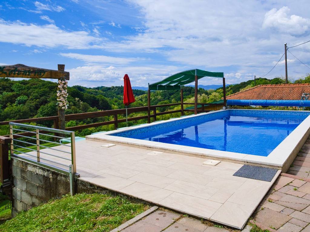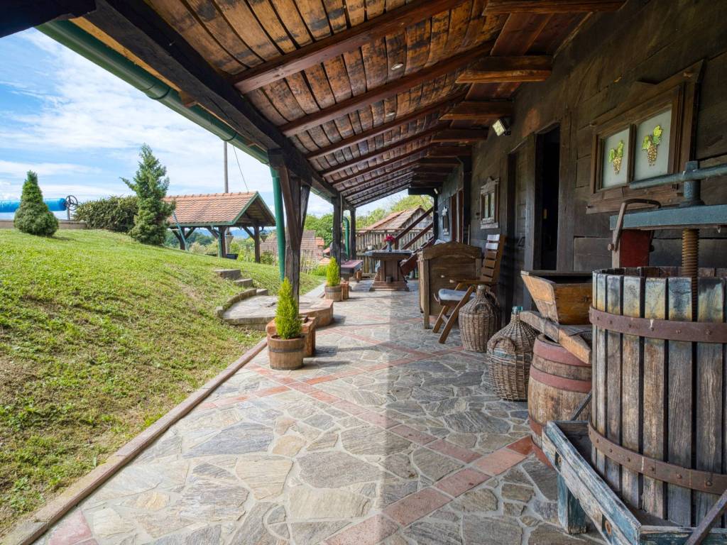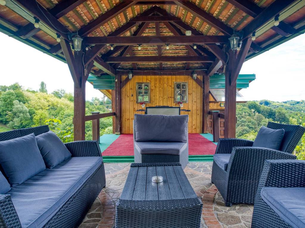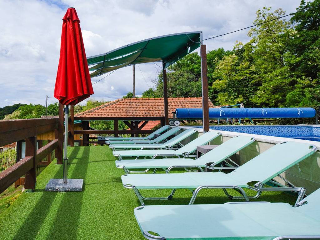 Ispred kuće je veliki vanjski bazen s terasom za sunčanje, koja pruža prekrasni pogled u daljinu na zagorske brege. U sklopu imanja nalazi se zidana terasa gdje gosti mogu koristiti roštilj, krušnu peć, peku i kotlić.