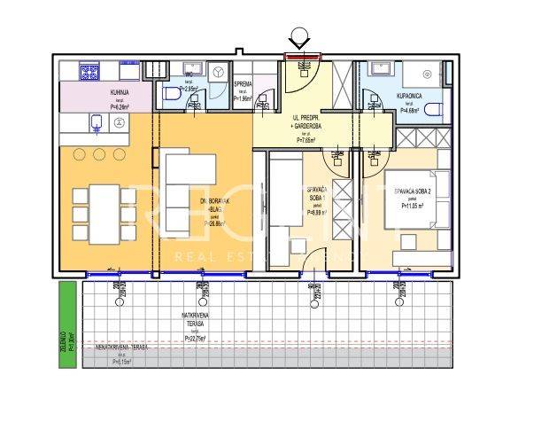 U ponudi je dvosoban stan u smješten u nadgrađu moderne stambene zgrade unutar projekta Sunny Cliff Residence. Stan se sastoji od ulaznog prostora s garderobom, prostranog dnevnog boravka s blagovaonicom, kuhinje, dvije spavaće sobe, kupaonice, odvojenog WC-a, spremišta i bazena. Zatvorena površina stana iznosi 70,42 m². Pripada mu natkrivena terasa površine 22,75 m², nenatkrivena terasa od 6,15 m² te zelena površina od 1,30 m². Ukupna površina stana iznosi 83,60 m². Projekt uključuje visoke standarde gradnje, lift, troslojnu stolariju, ventilacijski sustav i dizalice topline, dok je u kupaonicama predviđeno podno grijanje. Uređenje okoliša uključuje mediteransku hortikulturu i zajedničke sadržaje poput dječjeg parka. Završetak radova predviđen je za ljeto 2027. godine. Parking mjesto u podzemnoj garaži dostupno je po cijeni od 30.000 €. Moguće je plaćanje po fazama izgradnje ili putem stambenog kredita. Za više informacija ili dogovor razgledavanja, slobodno nas kontaktirajte!