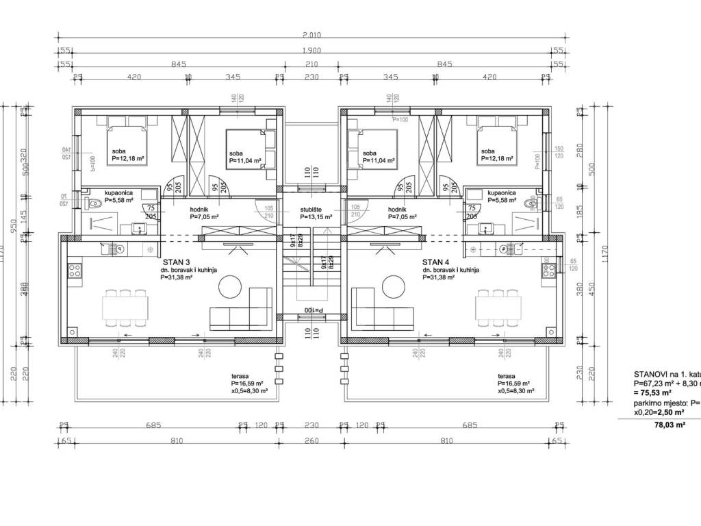 Na prodaju je stan na prvom katu novogradnje u Sukošanu, s površinom od 78 m2. Smješten je u mirnom okruženju stabala maslina s pogledom na obližnju plažu udaljenu svega 200 metara.
