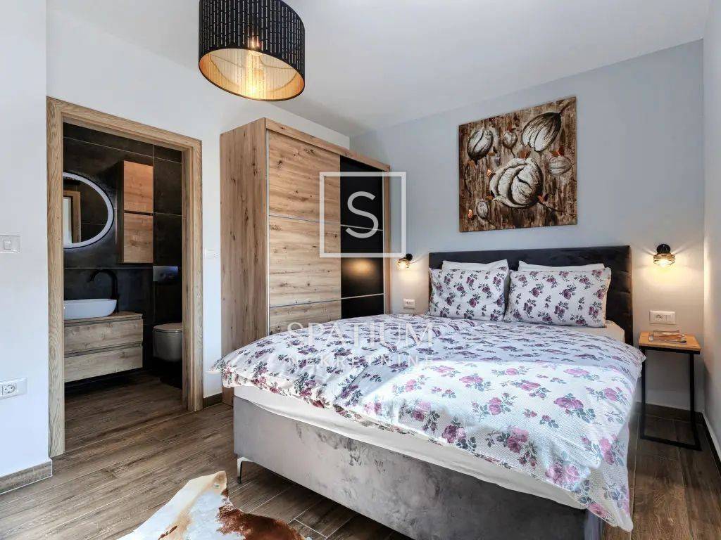 Kuća se prostire na prizemlje i prvi kat. U prizemlju se nalazi spavaća soba s vlastitom kupaonicom, moderna kuhinja s ostavom povezana s dnevnim boravkom, dodatni WC te popločana terasa stvorena za opuštanje uz grijani bazen i pogled na prirodu. Unutarnje stepenište vodi na prvi kat gdje su smještene još tri spavaće sobe, dvije kupaonice i terasa s otvorenim, panoramskim pogledom.