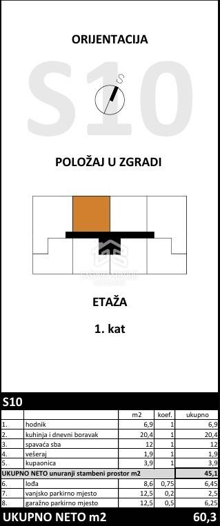 U sklopu projekta Bregana 2 prodaje se stan S10 u kvalitetnoj novogradnji na atraktivnoj lokaciji u Bregani. Stan se nalazi na prvom katu stambene zgrade s liftom te ima neto površinu 45,1 m², dok ukupna obračunska površina iznosi 60,3 m².