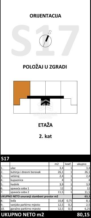 U sklopu projekta Bregana 2 prodaje se stan S17 u kvalitetnoj novogradnji na atraktivnoj lokaciji u Bregani. Stan se nalazi na drugom katu stambene zgrade s liftom te ima neto površinu 63,3 m², dok ukupna obračunska površina iznosi 80,15 m².