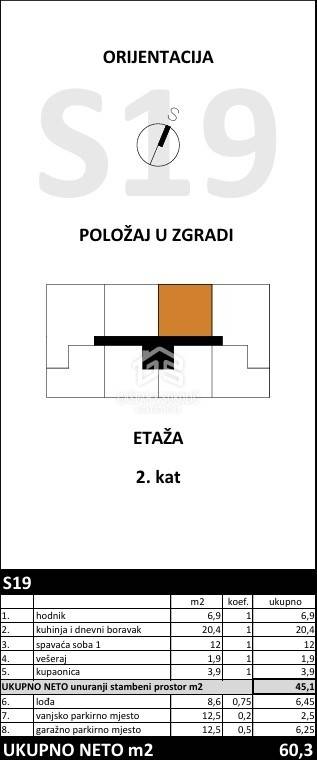 U sklopu projekta Bregana 2 prodaje se stan S19 u kvalitetnoj novogradnji na atraktivnoj lokaciji u Bregani. Stan se nalazi na drugom katu stambene zgrade s liftom te ima neto površinu 45,1 m², dok ukupna obračunska površina iznosi 60,3 m².